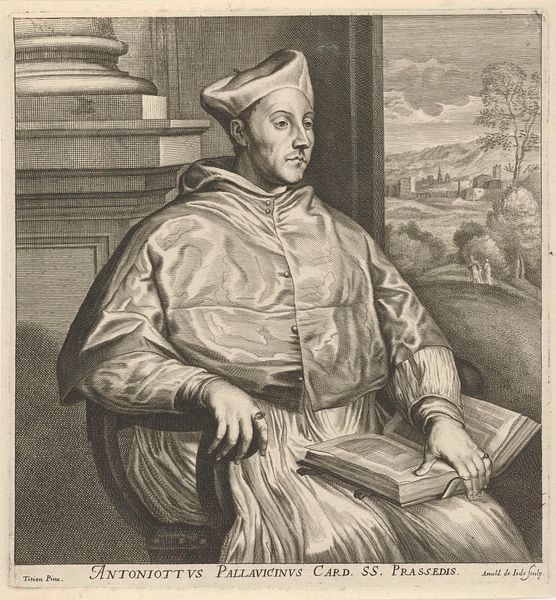 Editor: Here we have "Portret van bisschop Johannes Wachtendonck," a print from somewhere between 1654 and 1690, by Pieter van Schuppen. There's such a formality to this work—an imposing, serious mood. How would you interpret it? Curator: It's intriguing, isn't it? Beyond the obvious representation of authority—look at the sheer detail rendered in the engraving! You can almost feel the weight of his vestments. To me, though, it’s more about the captured moment, the psychological depth of the man. He holds that book almost defensively, as if guarding his thoughts. The engraving itself, a relatively new medium, allowed for a dissemination of this image – propagating the bishop’s presence. It's fascinating to think how many saw him, if only in print! Does his expression say anything to you? Editor: He does seem a bit…uncomfortable? Less like a man in power, more like a man burdened by it. Curator: Precisely! And notice the contrast. The bishop is set against this plain background. Where do you think his gaze directs? Editor: Towards us, the viewers. It feels like an invitation, but a hesitant one. I wonder if the artist, van Schuppen, was making a statement about the church, or simply capturing his subject honestly. Curator: Or perhaps both! It’s the artist’s tightrope walk – honoring the commission while leaving space for observation. The Baroque thrived on this dramatic tension between surface and depth. It seems simple enough, until you dive into the cross-currents of power, belief, and representation! Editor: I never considered how much a single portrait could reveal. This engraving really makes you think beyond the surface. Curator: Absolutely. And hopefully encourages you to bring your own experiences, understandings and impressions to the artwork, regardless of time or context!