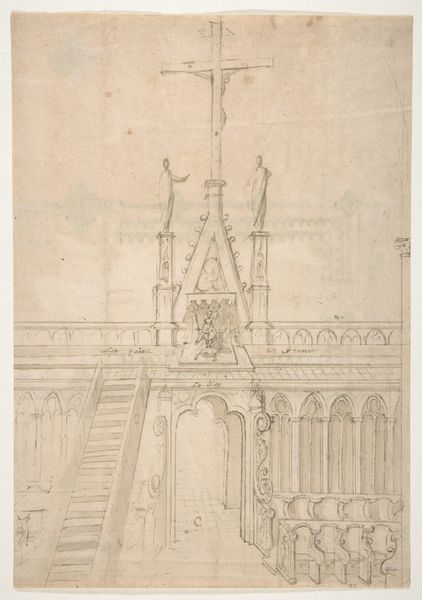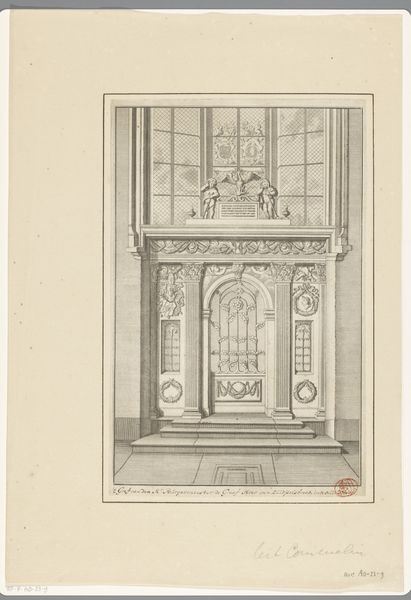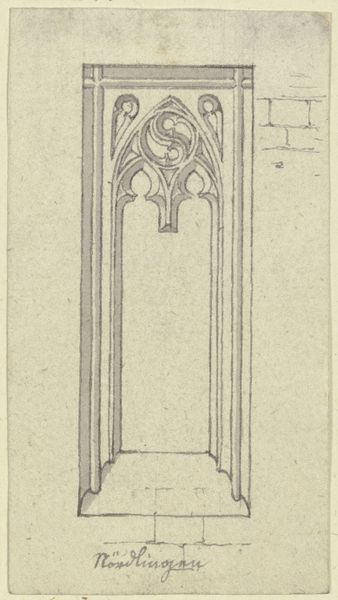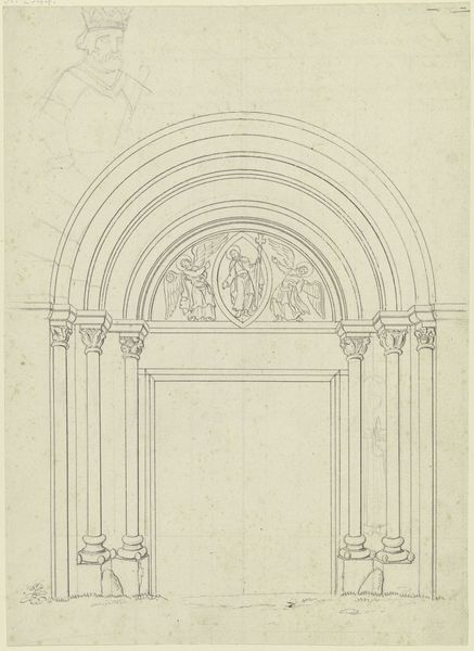 Editor: Here we have Karl Ballenberger's "Gothic Portal in Oberdachstetten with Christ Crowned with Thorns in the Tympanum," a drawing rendered in pencil, ink, and etching on paper. The precision of the line work is quite striking, it looks almost like an architectural blueprint. What initially captures your attention? Curator: I am drawn to the structural integrity displayed. Observe how the artist employs line and form to create a sense of depth and architectural grandeur. The interplay between the geometric precision of the portal and the organic detail of the ornamentation presents a compelling visual dialogue. The composition guides the viewer's eye upward, emphasizing the symbolic importance of the tympanum. Editor: The use of geometric patterns definitely lends a sense of the divine, drawing my eyes upward toward the thorns above. But is there something more we can extract? Curator: Precisely! Reflect on the contrast between the solidity of the stone and the ethereal quality of the line. The artist manipulates light and shadow through delicate hatching, thereby accentuating the tactile quality of the stone. Consider how the geometric is enhanced by this manipulation of tone. Do you observe the implied weight and mass? Editor: Now that you point it out, I appreciate how those implied effects work together. Curator: And consider also the medium: pencil, ink, etching. Layering these elements brings out both clarity of form and an evocative sense of surface. It yields an architectural feat in detailed miniature. Editor: I can see it, thanks to your explanations, both the precision and a kind of weightless aspiration that plays on a kind of geometry-based romanticism. Curator: Indeed, the tension between these readings is the generative friction from which the artwork arises. I find new details in every viewing.