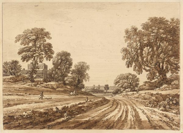 Editor: This is “Landscape with a Cornfield and Farm in the Distance,” created in 1742 by Christian Wilhelm Ernst Dietrich. It's an etching, and I find myself strangely calmed by the pastoral scene, despite its intricate detail. What jumps out at you? Curator: Calm is a good word for it. It reminds me of simpler times, even though life back then was probably anything but simple. It’s almost like a memory, viewed through gauze. The details are there, the fields, the homes… the almost fairytale touch with what could be a stork's nest perched so prominently. Notice how the furrows in the field draw your eye into the heart of the landscape; do they offer any clue as to what the future holds? Editor: I hadn't considered the perspective pulling us forward. I just thought it created depth. But futures, hmm... Do you think the artist was consciously building meaning like that? Curator: Oh, consciously? Perhaps, perhaps not. An artist creates, and we, the viewers, project ourselves onto that creation. What we find is as much about us as it is about them. Are we destined to a path already lain for us? Or perhaps our choices may have been the wrong direction, in hindsight? It also brings into consideration the vast amount of agricultural paintings of this age and who those images were designed to placate, or attract. Editor: That’s such a good point. Thinking about audience changes everything. Thanks! It sounds as if our impressions change the context quite profoundly too. Curator: Indeed. Each viewer writes their own version of its story, creating a symphony of perspectives, all starting from Dietrich's singular, sparked emotion etched in copper.