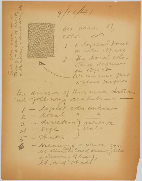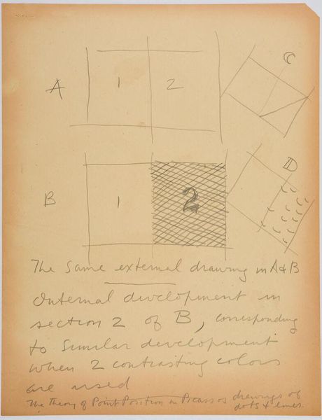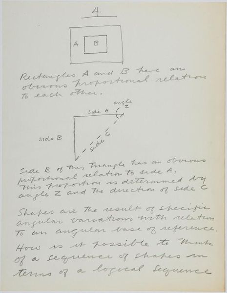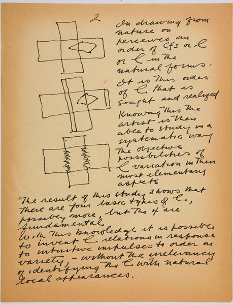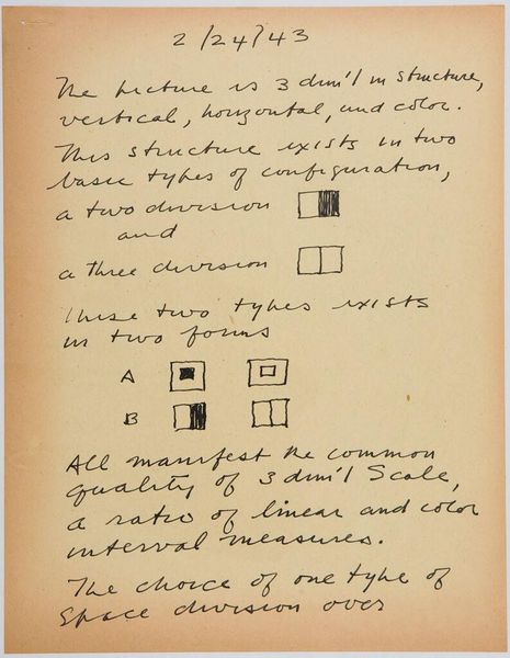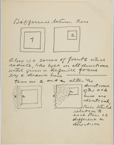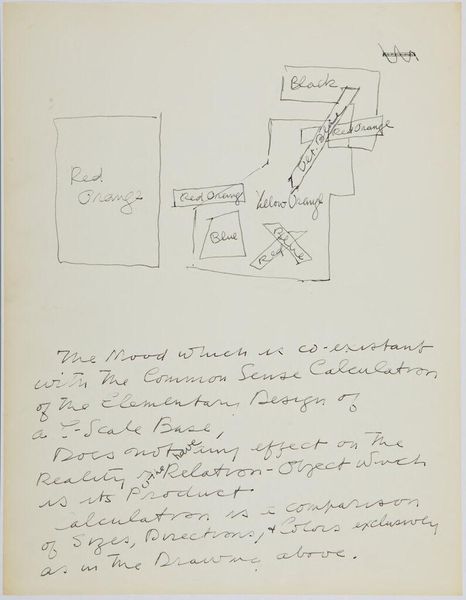 Curator: Here we have Stuart Davis’s "Art Theory Text with Diagrams" from the Harvard Art Museums. It's a handwritten page filled with text and simple geometric shapes. Editor: My first thought? This looks like the visual equivalent of someone trying to explain a joke that's already hilarious on its own. Curator: Well, Davis was deeply invested in abstracting the American experience, the kind of brash modernity you found in jazz and advertising. He believed art could be broken down to its fundamental components. Editor: So, these squares, these relationships… they’re the building blocks? But doesn't deconstructing something sometimes flatten its original magic? Curator: Perhaps, but Davis saw it as empowerment. He wanted everyone to understand the underlying structure, to see that art isn't some mystical thing, but a series of choices. Editor: I get that. But I still prefer to feel my way through a painting, to let it wash over me. This feels like homework. Curator: And maybe that's the point, to engage the mind as much as the eye. Davis wasn’t just creating, he was teaching us how to see. Editor: A noble goal. I’m just not sure I’m ready for the lecture today.