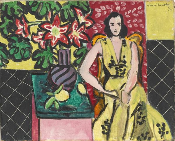 Editor: So this is Otto Mueller's "Marischka Mit Maske," painted in 1919. It’s oil on canvas and is currently at the Folkwang Museum. I’m immediately struck by how the mask seems to almost be looming over the figure. It makes me wonder about what's being hidden, and by whom. What do you make of the relationship between the figure and the mask in this painting? Curator: I think that's a really astute observation. Consider the historical context: 1919 Germany, still reeling from WWI. Expressionism as a movement was deeply concerned with the individual's experience in a rapidly changing world, often exploring themes of alienation and identity. What do you think the mask represents in this environment, and how might the woman’s gaze challenge traditional portrayals of femininity at that time? Editor: Well, the mask feels almost… threatening, like a primal representation of some sort of ancestral, male gaze. But the woman is looking almost defiantly back at us. Curator: Exactly! And who do you think the “us” is in that scenario? Editor: Hmm, well probably the traditional, wealthy, and patriarchal art viewers of the time. So you are thinking the figure almost has a dialogue going on between historical ideas and expectations about what women can be versus what she aspires to? Curator: Precisely! I wonder too how the choice to depict the woman with what was considered to be a rather modern bobbed hairstyle helps in understanding Mueller’s work. In this respect, the painting engages with not just representation of, but participation within modernity, which opens space for discussion of sexuality, politics, and economics of Germany in that era. The layering going on here is something quite intriguing. Editor: It certainly is. I'm now seeing layers within layers of commentary, all thanks to thinking more about the historical context. It’s much deeper than just a portrait with a mask. Curator: Indeed! Looking at art this way, as part of ongoing dialogues rather than static objects, is crucial for understanding its enduring power.