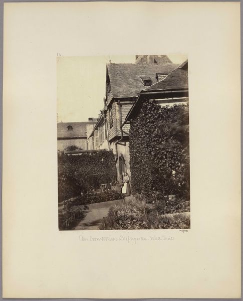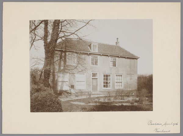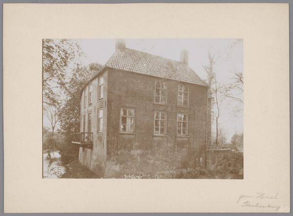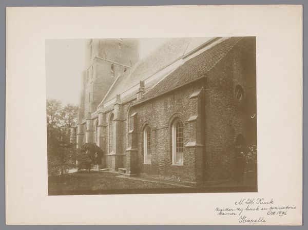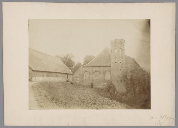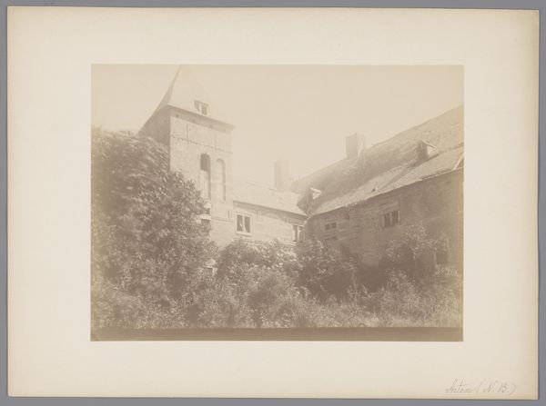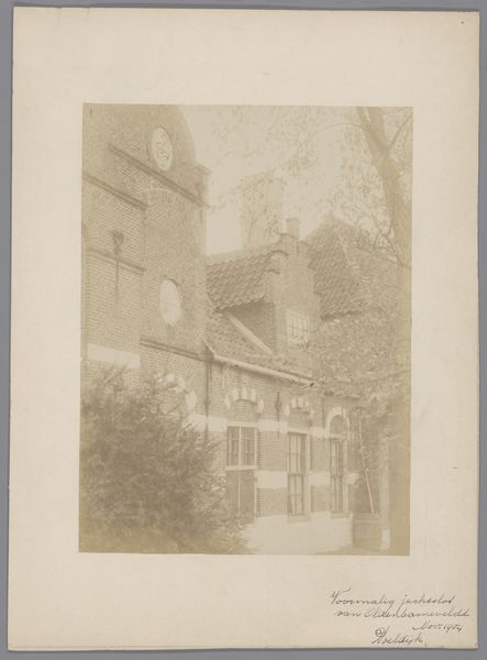 Curator: This gelatin silver print, captured in 1904, presents the courtyard of the chapel of the Cross-bearers in Uden. Editor: My first thought is melancholy; the monochrome palette and the skeletal trees give a distinct sense of dormancy, as though holding its breath in the fading light. Curator: Indeed. The stark architectural lines and repetitive forms evoke a feeling of containment and quiet contemplation, where light and shadow seem carefully balanced. Editor: I notice the climbing ivy which partly obscures and enlivens some of the stone; an indication of nature reclaiming what's sacred? Perhaps pointing toward humanity's relationship with devotion. Curator: An interesting interpretation! Structurally, the photo directs the eye along a subtly diagonal leading from the darker elements of the foregound upward towards the right, creating tension between the lighter elements on the horizon, like that chapel spire, versus this imposing edifice on the left. The architectonic rendering of this form surely meant something profound to its residents. Editor: Precisely! And the symbolic nature of enclosure, the inner sanctum...It speaks to a collective pursuit of solace or enlightenment within the protected, quiet confines that are shown here, don't you agree? It evokes a sort of shared introspection that comes from within. Curator: Perhaps that intersection between the forms you have spoken about also gestures towards the tensions that underscore the idea of the religious calling as simultaneously an act of being alone, while finding communion. Editor: I agree. To step back, one has the sense of these two forms mirroring the act of leaving and cleaving together simultaneously, beautifully encapsulating something about a shared experience. Curator: It really is remarkable how this ostensibly simple architectural image subtly engages ideas about isolation, nature, devotion, light, and shadow, wouldn't you agree? Editor: Absolutely! What a visual meditation on silence and solidarity this offers.