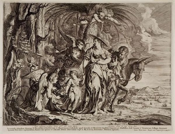 Curator: Elisabeth Sophie Chéron created this print, titled "Dead Christ." Editor: The scene is overwhelmingly somber. The figures surrounding Christ are draped in sorrow, their faces etched with grief. Curator: Observe how Chéron uses light and shadow, guiding our eyes to the body of Christ, emphasizing his vulnerability. The cherubs above underscore the divine aspect of the scene. Editor: The posture of the figures, the positioning of Christ, it all speaks to the performative nature of mourning in a patriarchal society. Who is allowed to grieve, and how? Curator: Consider the symbolism of the cave, a recurring motif representing both death and rebirth. It speaks to the cyclical nature of life and the promise of resurrection. Editor: Yes, and the inscription "He was struck because of the crimes of his people" also hints at themes of collective guilt and responsibility. Curator: It's a work that invites contemplation on faith, loss, and the human condition. Editor: Definitely, prompting us to consider the personal and political dimensions of grief and redemption.