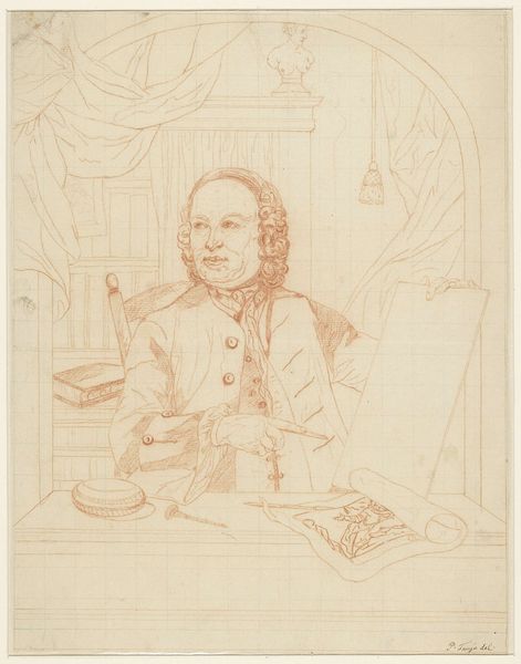 Curator: This is a striking pencil drawing by Jan Anton Garemyn, titled "Portret van een zittende geestelijke, bijna ten voeten uit, en face," created sometime between 1722 and 1799. The portrait depicts a seated cleric. What are your initial impressions? Editor: Wow, it has this spectral quality, doesn’t it? Like a ghost just materializing from the paper. There's a grid underlying the sketch, which gives it this wonderfully unresolved feel, as if it were caught mid-creation, betwixt and between realms. Curator: The visible grid actually gives us insight into Garemyn’s artistic process. It suggests a methodical approach to mapping and scaling his subject, probably to prepare a much larger piece. We must understand the significance of representing a cleric in this era. The church wielded considerable power, making these portraits laden with symbolic weight. Editor: It’s more than power for me. The pose, almost slouched, and the way the robe just falls…there’s a quietude. See how his hands rest? They look relaxed, yet his expression is… unreadable. As a portrait it becomes more personal for me; I’m asking, what was he truly thinking, beneath those clerical layers? The grid only adds another, structural layer to his enigmatic presentation. Curator: These commissions often played a critical public role in image politics, designed to project an image of respectability, authority, and piety. Artists in the 18th century were caught between creating an individual likeness and fulfilling those expectations, which dictated pose, attire, and even expression. Editor: Perhaps. Still, I can’t shake the feeling of a vulnerable person beneath the pomp. Maybe Garemyn cleverly introduced it or captured what would come off almost despite of him. Curator: I can certainly appreciate your read of that vulnerability. Analyzing this artwork reveals the push and pull between individual expression and societal expectation. Editor: Ultimately it speaks to a struggle, timeless as humanity itself. So glad to see ghosts and the people within come out, even if they're faint with pencil lead and time.