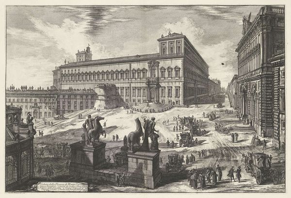 Editor: We’re looking at "Piazza del Quirinale in Rome," an etching made sometime between 1747 and 1761 by Mariano Vasi. The level of detail is incredible, especially capturing the architecture. What jumps out at you? Curator: Oh, this bustling Piazza! I can almost hear the clip-clop of hooves on the cobblestones, the murmur of the crowds. It's more than just a cityscape; it's a snapshot of a living, breathing moment frozen in time. The artist masterfully captures the play of light and shadow. What do you think about the Baroque elements? Editor: Well, the grandeur of the buildings, especially the Quirinale Palace itself, certainly feels very Baroque. The dramatic perspective, too. Curator: Exactly! See how Vasi uses perspective to draw the eye towards the center, creating a sense of depth and grandeur. But beyond that, there’s a quiet drama unfolding. Consider the figures – are they merely inhabitants, or do they play a part in some larger narrative we are only given glimpses of? What do you think they're doing? Editor: They seem to be going about their daily lives... perhaps officials heading to the palace or just citizens enjoying the piazza? Curator: Perhaps. It’s in that ambiguity, in the whisper of untold stories, that the work finds its magic, don’t you think? It becomes less about documenting a place, and more about hinting at its hidden life. The paper and ink feel incredibly intimate; they take me back to a period I could not live through but suddenly understand. Editor: That's a lovely thought. The idea that a cityscape can be so full of untold stories. I'll definitely be looking at these types of prints with a different perspective from now on. Curator: It is a pleasure. Always consider where the work can take you. What does it make you feel? That is how we keep art alive.