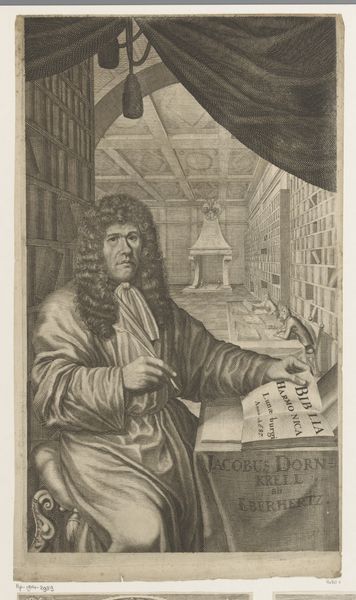 This is Martin Bouche’s “Portrait of J.F. Herrebertus” made in the late 17th century. The print depicts a man of learning surrounded by symbols of knowledge. It is important to consider the context of the Dutch Golden Age. The Dutch Republic experienced a period of unprecedented economic, scientific, and artistic growth. This portrait reflects the values of a society that placed a high emphasis on education and intellectual pursuits. Yet, it should be said that this progress and wealth was built on the exploitation of enslaved people through colonization. The portrait itself is a study in self-presentation. Herrebertus is depicted with a globe, pen, and paper which signal his engagement with intellectual and scientific endeavors. These were powerful symbols of status and identity in a society that valued knowledge and discovery. Bouche presents an image of scholarly authority, while hinting at the complex societal structures that enabled such privilege.