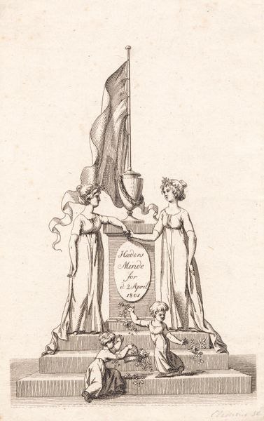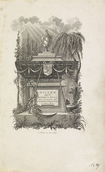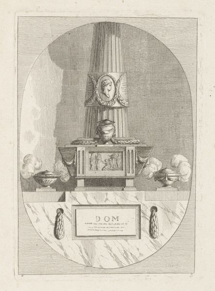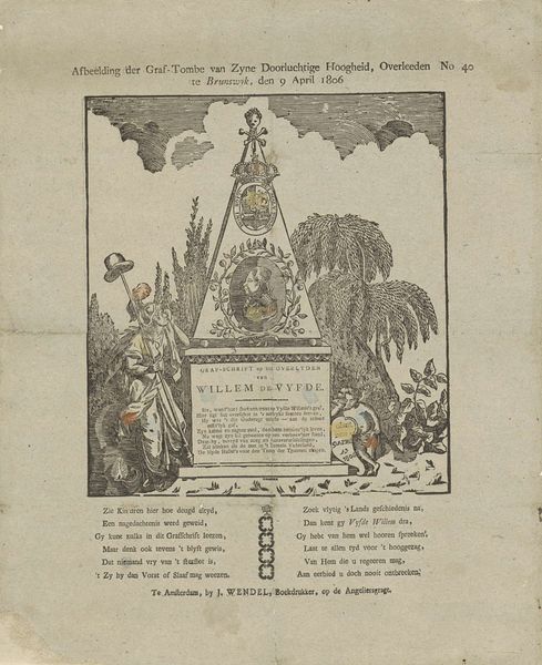 Curator: What a delightfully acidic visual! We're looking at "Spotprent over de bijdragen van Indie aan de schatkist," or "Cartoon about the contributions of the Dutch East Indies to the treasury" from 1863, crafted by Johan Michaël Schmidt Crans. Editor: My first thought? I feel the bite of satire. The style looks straightforward enough—lines of ink engraving doing that neat little dance, all precise—but the whole composition makes me smile ruefully. What am I even looking at exactly? Curator: Indeed, the work is steeped in satire and orientalism. Six kneeling figures face a pedestal upon which rests a golden calf emblazoned with "f12.000.000" --12 million florins! Banners proclaim, among other sentiments, fighting over nature's enjoyment! This whole arrangement is so absurd it is very much a cartoon of the economic situation of the Dutch East Indies. Editor: So the figures represent those profiting from or beholden to colonial extraction? Are they bowing down to what could be called, in the parlance of today, economic idol worship? How perfectly scandalous. Even down to that tagline, almost snarking: "Who will be Moses and break the Golden Calf?" It hints, of course, at systemic idolatry, right? Curator: Absolutely. Notice the Romantic flourish of the piece! Schmidt Crans has subtly embedded history painting in the political message, borrowing from a recognizable and weighty context. Editor: Now that you point that out, yes! Look at the windmill depicted far off to the left! These symbols feel less about glorifying the current moment and more like a lament that subtly reveals what's broken in this colonial arrangement, though I see why we must contextualize with orientalism, since the symbolism isn't a direct comparison of Indonesia to Europe and uses certain popular romantic tropes. Even that touch of detail, with the budding flowers at the base—a sad little stand of life. They whisper that amidst such economic fervor, beauty gets neglected. Curator: I fully agree. Its crude form, that contrasts with what the artist actually depicts, allows for layers of interrogation that continue to be insightful. What begins as a pointed political statement broadens into something enduringly potent. Editor: Agreed. And while it's a stark picture, the cartoon brings forth so many issues still in our modern times. A powerful reflection using very straightforward but cutting techniques.