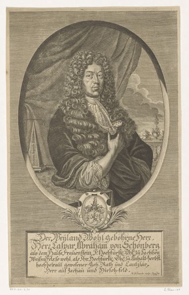 Curator: Here we have Philibert Bouttats' engraving of Willem III, Prince of Orange. The work, completed between 1702 and 1726, captures the baroque style so prominent in portraits of the era. Editor: It's rather… intense. The crown floating above him, the elaborate drapery—it all screams "power," but somehow feels a little suffocating, too. Does anyone really need *that* much hair? Curator: Well, let's unpack that a bit. This image, and prints like it, served as propaganda, projecting an image of authority, of divine right. Note the inscription declaring William as King of England, Scotland, France, and Ireland. The hair, the lace, the armour—it's all carefully constructed regalia. Editor: I get the symbolic overload, I really do. But look closer—the hatching, the limited contrast… it lends this formal portrait an almost ghostly quality. He looks burdened, like all this royal weight is crushing him. It makes you wonder what it must have felt like to actually be him. Curator: That's a brilliant observation. Printmaking served a key role during this time, disseminating the likeness and authority of rulers like William III. This engraving would have been circulated widely, reinforcing his image and solidifying his political power across Europe. It represents the politics of imagery at its finest. Editor: And yet, stripped of the color, presented in these stark lines… he becomes oddly human. Like a character in a rather morbid play. I find it quite touching. Curator: Indeed. These details add so much to understanding how even in the process of crafting symbols, there’s a certain personality imprinted. Editor: It makes the historical figure of William less like a distant name in a history book, and much more like, perhaps, one of us. An unexpected window onto another person’s experience! Curator: Agreed. Perhaps that’s what good art always brings—insight that moves across the years.