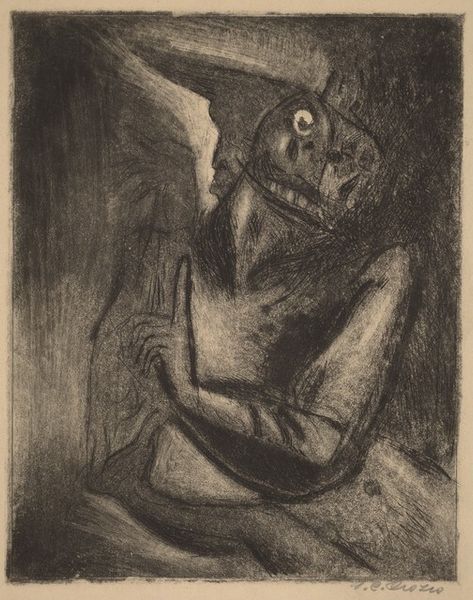 Editor: This drawing, "Der Friedensrichter" by Karl Wiener, is quite striking! It feels very stylized, almost like a woodcut, despite being a drawing. There's a clear focus on strong, geometric shapes. How do you interpret this work? Curator: Well, immediately I’m struck by how Wiener uses caricature. Notice the exaggerated nose and jawline, the simplification of features. Caricature is an interesting visual language. Historically, it's often deployed as a form of social commentary or even satire, to expose hypocrisy or injustice. What feeling do you get from this man’s upward gaze? Editor: Hmm, thoughtful, perhaps? Or maybe even a bit haughty, given the pronounced features? It's hard to tell. I didn’t catch the commentary aspect initially. Curator: Precisely! That ambiguity is crucial. Is he a figure to be admired, or is the artist subtly mocking him? Look closely at the shadows. How do they alter the perception of the face? The harsh lighting contributes to this ambiguity, wouldn’t you agree? Editor: Absolutely. The light definitely adds a theatrical quality to the piece. Is there a particular cultural context that is essential to grasp the nuances within the image? Curator: Understanding the role of judges in that society – their perceived power and moral standing – is definitely key to unlocking some potential interpretations. The title itself, "The Justice of the Peace," invites scrutiny of this figure's character and authority. Consider how ideas of justice and fairness are embodied - or challenged - by this very specific representation. Editor: This has been enlightening! I'll definitely look at caricatures differently now, paying closer attention to those symbolic and cultural undercurrents. Curator: Indeed, and consider how such symbols shape, and are shaped by, collective memory. Every image, however simple, is part of a wider cultural conversation.