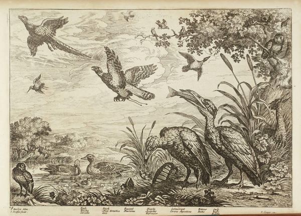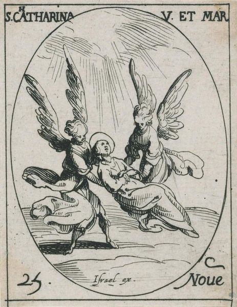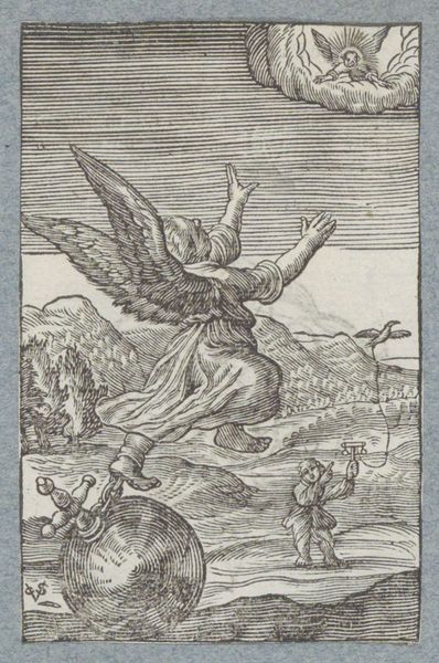 Curator: What a curious image! It feels like looking at a dream. Editor: Indeed. We're looking at "Fabel van de arend, de kraai en de schildpad" (Fable of the eagle, the crow and the turtle), an etching and engraving from 1769 by Simon Fokke. It's currently held in the collection of the Rijksmuseum. Curator: The line work is striking—very graphic and stylized. Everything is reduced to its most essential form. It's a dance of pure contour, really. How do you feel about the overall structure? Editor: I feel a weird sense of whimsy mixed with dread. The landscape is quite stark; that craggy rock in the foreground is very imposing. Then there's this odd trio floating in the sky, each isolated in its own little bubble of space. The poor turtle! Curator: Absolutely, and note the sharp contrast in textures. The meticulous cross-hatching on the rocks, mimicking volume and depth. Compared with the relatively smoother surfaces of the animals and clouds above. This creates visual tension. Fokke is using varied engraving techniques to delineate space and importance. Editor: It looks less like a landscape, though, and more like a stage for some kind of… moral lesson? Given the title includes a fable. Curator: Fables inherently rely on symbolism, yes. Observe how Fokke employs a high horizon line, which flattens the composition, drawing immediate focus to the subjects themselves. The spatial compression intensifies their relationship, highlighting their symbolic interaction within a structured narrative space. The eagle is a traditional emblem of power, the crow often associated with cunning, and the turtle, steadfastness or naiveté. Editor: This composition… it’s really doing something to me! It is sort of ominous. Is that because it's old and the animals don't seem cuddly? Like the turtle looks almost anxious, being flown up into the sky, and those birds are so steely eyed! All stark lines, all black and white. This really resonates even now. Curator: The absence of color is crucial here. It simplifies and universalizes the narrative, enabling the viewer to concentrate solely on the relationships between form and content. A calculated technique enhancing its allegorical effect, definitely. Editor: Well, after thinking about it this way I have a lot more respect for such a weird old fable. It’s not just telling a story but really using design to set the mood. Curator: Precisely. Fokke's command of engraving conventions imbues "Fable" with complex layers, inviting perpetual scrutiny, it merits the name!