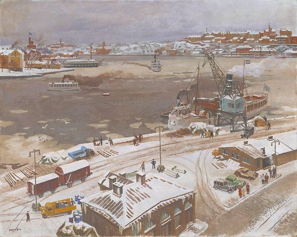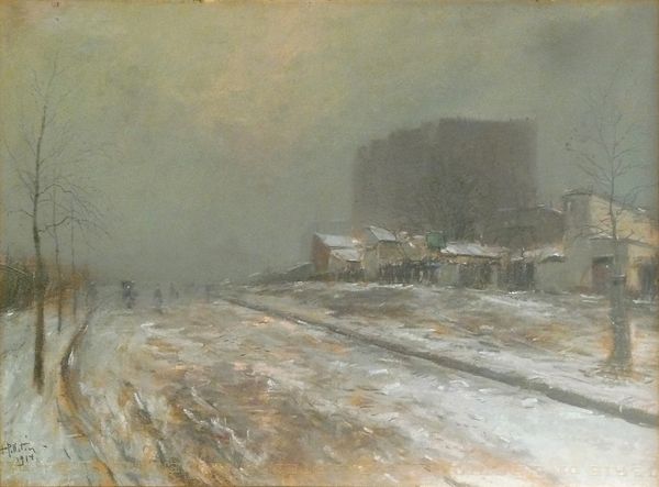 Editor: This is Antoine Villard's "Circuit Railway at Grenelle," painted sometime in the early 20th century. The heavy brushstrokes and bleak palette create such a somber mood. What stands out to you? Curator: The painting powerfully reflects the industrialized landscape and its impact on the urban environment and society. How does the composition suggest a specific point of view or agenda? Editor: Well, the elevated perspective almost feels like a critique from above, highlighting the stark reality of urban development. Is that a fair reading? Curator: Possibly. Consider also how such images shaped public perception and even policy regarding urban planning during that era. Editor: I see. It's not just a picture; it's a statement about the changing world and how people felt about it. Curator: Precisely. Art often plays a role in shaping such narratives.