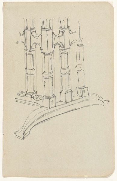 Editor: So, we are looking at "Schets van het onderstel van een tafel," a sketch of a table base by Gerrit Willem Dijsselhof, made sometime between 1876 and 1924, using pencil and pen. I'm immediately struck by how architectural it feels. It's just a sketch, but there's a sense of grandeur even in this simple design. What do you make of it? Curator: The drawing does present the functional object as if it was architecture, which certainly has resonance within the historical context of the late 19th century. We see a merging of art and craft that was very much driven by a social consciousness to ennoble everyday objects. Is it simply a sketch, or could this be a deliberate aesthetic statement about functional art? Editor: That's interesting, the idea of elevating everyday objects. It also reminds me of a temple. Do you think there is any connection to Eastern art? Curator: Absolutely. The linear style, the geometric forms, certainly evoke the kind of visual vocabulary one sees being imported and integrated into Western art from Asia during this period, particularly Japanese art. This was happening at a time of expanding global trade and an increasing Western fascination with other cultures. How might this sketch speak to a desire to create something 'new' and visually distinct? Editor: Maybe by incorporating those different cultural elements. It seems like the artist wasn't just designing furniture but trying to make a statement about art and culture at the time. Curator: Precisely! It becomes less about the table itself, and more about Dijsselhof engaging with these socio-political and artistic dialogues, using his design to subtly promote this synthesis. The Rijksmuseum holding the work further suggests its cultural value, right? Editor: Definitely! It's amazing how much can be gleaned from a simple sketch. I'll never look at furniture designs the same way. Curator: And I’ll keep wondering what the role of museum spaces is, as it is about preserving functional designs with a historic cultural impact.
