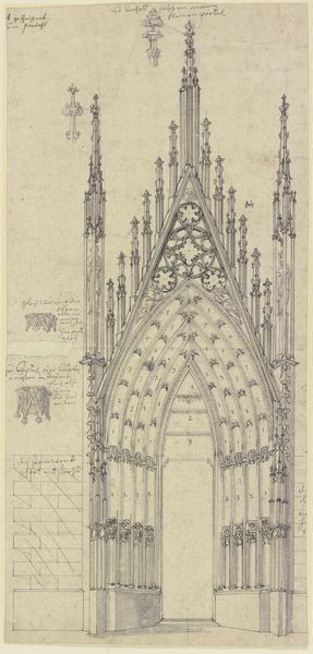 Editor: Here we have Johann Jakob Arhardt's drawing of the North Portal of the West Facade of Strasbourg Cathedral, created with pencil, chalk, graphite and ink. It's incredibly detailed! What strikes me most is the sheer dedication it must have taken to capture every tiny detail. What do you see in this piece? Curator: Well, viewing this through a historical lens, it’s important to remember Strasbourg's complex identity, particularly during periods of conflict between France and Germany. The Cathedral itself becomes a symbol of that struggle. How might Arhardt’s depiction of this specific portal, at this time, reinforce or perhaps even challenge dominant narratives surrounding the city's identity? Editor: That's interesting. I hadn't thought about the political implications. So the act of meticulously documenting a gothic structure can be more than just art, it becomes a statement? Curator: Precisely! Architectural drawings like this one played a significant role in shaping public perceptions. Who do you think was Arhardt’s intended audience? Editor: Perhaps architects or patrons interested in similar building projects? Curator: Possibly, but consider also the broader cultural context. Architectural drawings gained popularity as collectable art pieces among those interested in medieval culture during the baroque period. It became a sought after genre, with significant archival value. Editor: So this drawing existed not just as documentation, but as a cultural artifact representing the gothic style and the shifting identity of Strasbourg? Curator: Exactly! And how the meaning of gothic architecture may evolve over time and its impact on broader social and national identity in the region. This single drawing allows us a window into layers of socio-political context, cultural appreciation and how architectural form interacts with cultural significance. Editor: That gives me a completely different perspective on what I initially perceived as "just" a meticulous drawing. Thanks!