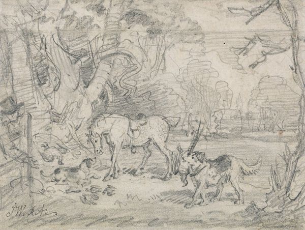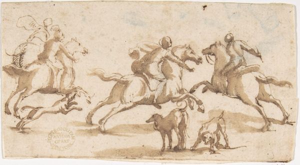 Curator: Let’s discuss this ink drawing titled "Europa," which the Met dates to somewhere between 1500 and 1600. Editor: It has a very dreamlike, pastoral quality. A landscape sketch punctuated by human figures, animals, and…Cupid hovering overhead. Curator: Right, the Italian Renaissance fascination with classical mythology is central here. "Europa" depicts the abduction of Europa by Zeus, disguised as a bull. It's part of a larger narrative, often interpreted as an allegory of power and desire. The gaze upon a woman in pursuit by power, both social and individual. Editor: The process of rendering here is interesting. I mean, look at the materials—simple ink on paper—yet the artist creates this palpable sense of depth. You can almost feel the heat shimmering off that landscape. It's also so economical in its production; drawing facilitates portability. What sort of drawing would have been preparatory or complete in itself? Curator: Good questions. Its narrative element resonates with stories of forced migration and power imbalances we see across history. The idea of Europa being carried away against her will holds some disturbing echoes. Zeus's deception, the vulnerability of Europa—these resonate uncomfortably in contemporary dialogues around consent and exploitation. Editor: Exactly. Think about the labor involved in papermaking at the time. What workshop generated the tools with which the image would be created? These social processes involved are too often absent when considering content alone. Also, the consumption is important. It can reach wide audiences given ink, paper and line. Curator: Precisely, understanding the intersection of history and representation allows us to question whose perspectives are centered, and whose are marginalized, no? Editor: I agree. Studying production allows you to recognize both consumption and creation as vital. Thanks. Curator: Thank you. The pleasure of shared thinking is all that matters in my view.