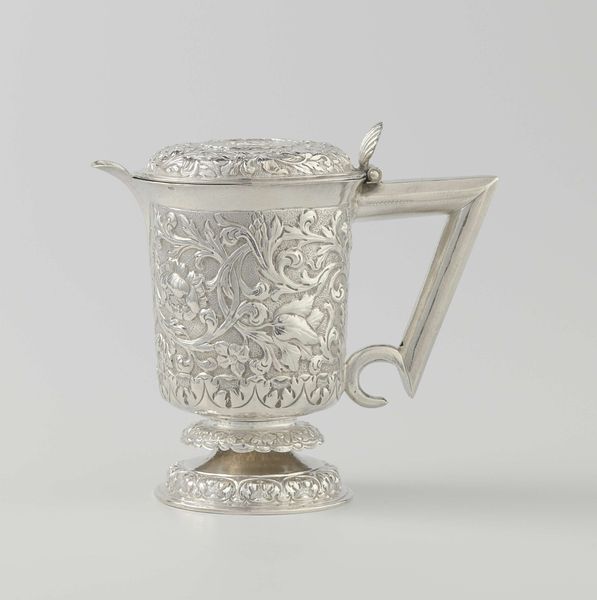 Editor: So, this little Dram Cup, made of silver, by Jacob Boelen, dates back to the late 17th century. It’s quite charming actually; the engravings feel delicate and personal. What strikes you about it? Curator: The cup itself is simple, but the engraved decorations carry a symbolic weight. Notice the stylized foliage: does it remind you of anything? Editor: I guess it sort of looks like abstracted leaves or perhaps even feathers? Curator: Precisely. Foliage often signifies growth, renewal, and connection to the natural world, a recurring theme in Baroque art. The form echoes classical motifs of regeneration. And what about the initials 'C.V.D.V.' inscribed prominently? Editor: That's intriguing. A maker's mark, maybe, or perhaps a family crest? Curator: Or initials referring to a motto, a dedication or even an individual. Symbols such as those initials became very important for identifying persons or objects in certain eras and also showed allegiance. The motifs served to give the user psychological assurances. How does this knowledge shift your view of the object? Editor: It makes it more intimate. I am seeing the cultural values now, adding layers of significance. Curator: Yes! Each sip from this cup would be more than refreshment, more like a communion with personal or family identity. These are artifacts layered with meaning. Editor: Absolutely. It is not just a cup, but a vessel holding cultural memory. I never would have seen that at first glance. Curator: Exactly. We are continually adding context to cultural evolution when interpreting visual cues.