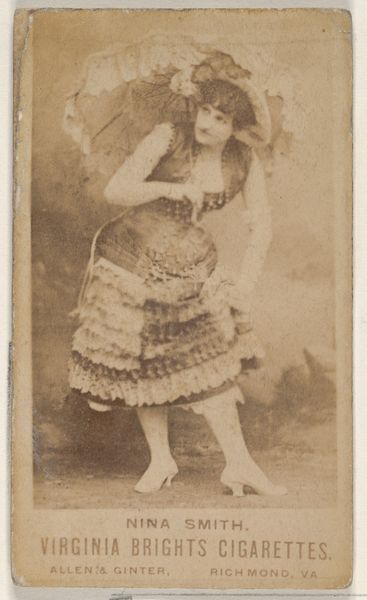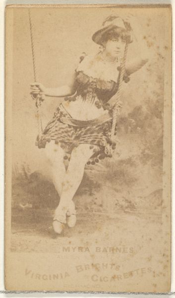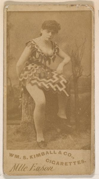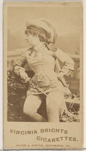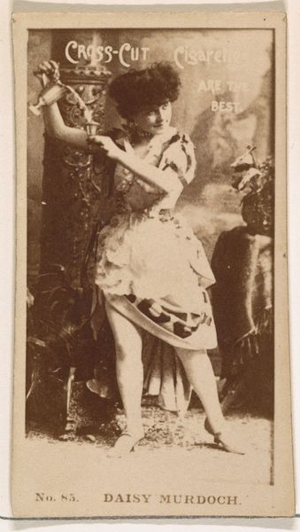 Editor: This is Card 453, Daisy Murdoch, from the Actors and Actresses series made between 1885 and 1891 for Virginia Brights Cigarettes by Allen & Ginter. It’s a small photographic print, sepia-toned, showing an actress striking a pose. There’s something unsettling about its objectification and its use as advertisement. How do you interpret this work? Curator: This seemingly simple advertisement card speaks volumes about the intersection of gender, commerce, and celebrity in the late 19th century. Consider the societal pressures on women during that period, where their images were often commodified and circulated for male consumption. It's not merely a portrait, but a curated performance, reflecting the ideals of femininity marketed to consumers of Virginia Brights Cigarettes. How does that intersection strike you, given our current understanding of gender roles and marketing? Editor: I hadn’t thought of it that way. It's troubling how it normalizes objectification by associating it with everyday consumption, like cigarettes. The card becomes a symbol of a deeply unequal power dynamic. Curator: Precisely. And who profits from this dynamic? Understanding the context of Allen & Ginter, a prominent tobacco company in Richmond, Virginia, is also critical. Their use of "actresses" underscores a specific social construct, a performative womanhood for the male gaze. What narrative is being subtly pushed regarding identity and aspiration, don’t you think? Editor: The actress’s aspirational status, linked with the Virginia brand, creates a subtle push of cultural value where certain identities are seen as worthy of being promoted. Curator: It’s also worth examining the racial context of Richmond, Virginia, a former Confederate capital. Considering how race was intricately woven into capitalist structures during this period is central to me, revealing how this advertisement reinforces certain norms while simultaneously invisibilizing others. Editor: This reframing has totally changed how I see this image! It's not just a portrait, but a loaded artifact of a specific time and power structure. Curator: Exactly! Examining this through the lens of social power dynamics helps us see the complex messages embedded within even seemingly innocuous advertisements. Editor: Thanks, I learned how the social historical lens allows to have a conversation between art history and theory.