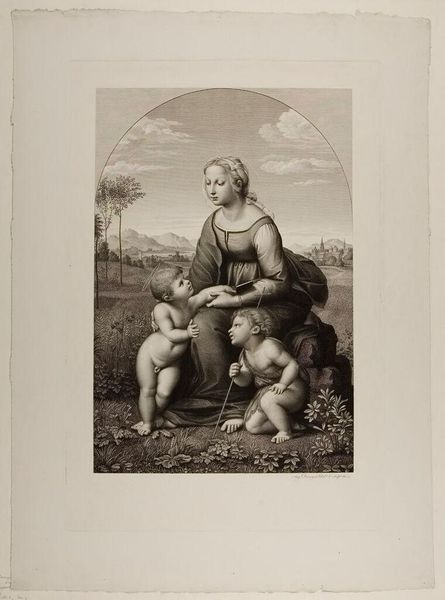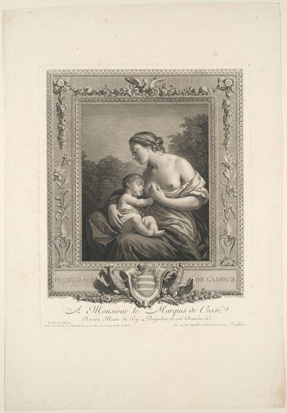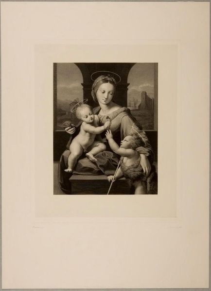 Editor: Here we have Antonio Banzo's "Charity," a print held at the Harvard Art Museums. It feels classical, almost like a Renaissance Madonna. What can you tell me about how this image functions within its cultural context? Curator: The image taps into a long tradition of representing idealised motherhood and female virtue, but it's crucial to consider the historical moment. How do socio-political ideals influence the creation and reception of these images? Editor: So, you're saying it's not just about the image itself, but the messages it sends in a particular society? Curator: Precisely. Images like this often served as visual propaganda, reinforcing societal expectations of women and promoting specific notions of charity and caregiving. What do you take away from that? Editor: It’s made me realize there’s a lot more to unpack than just the surface image. Thanks!