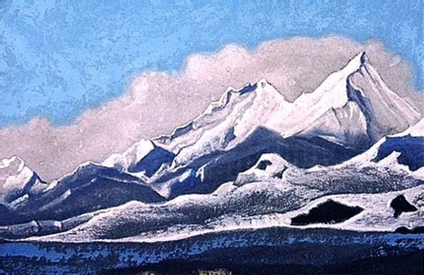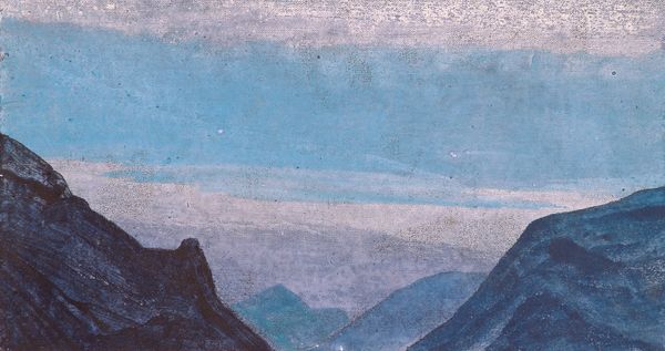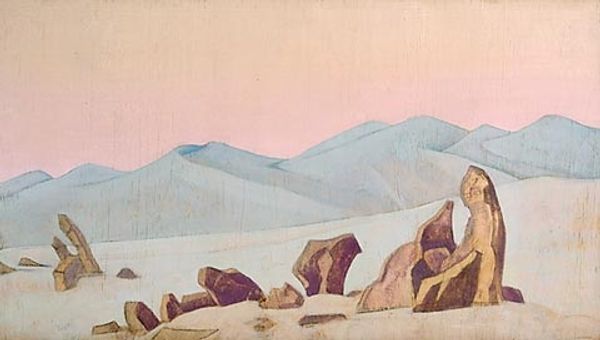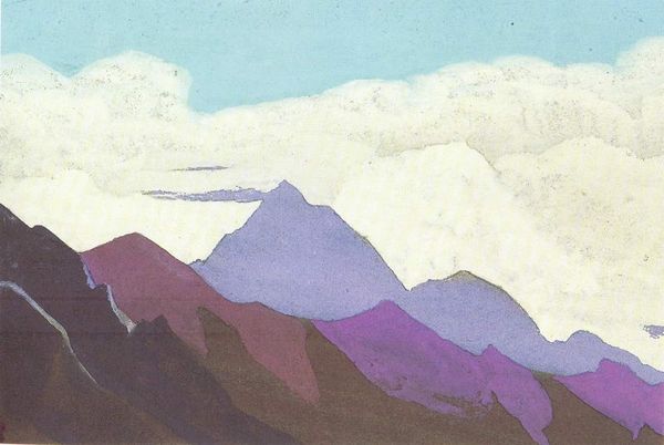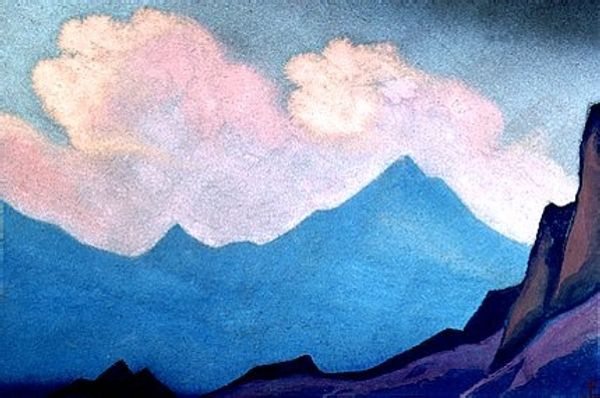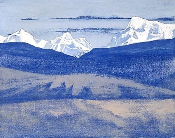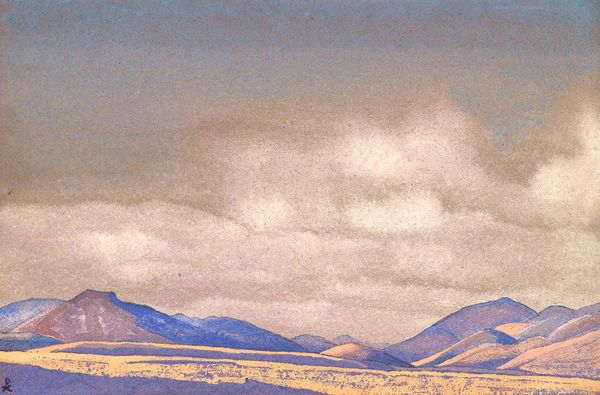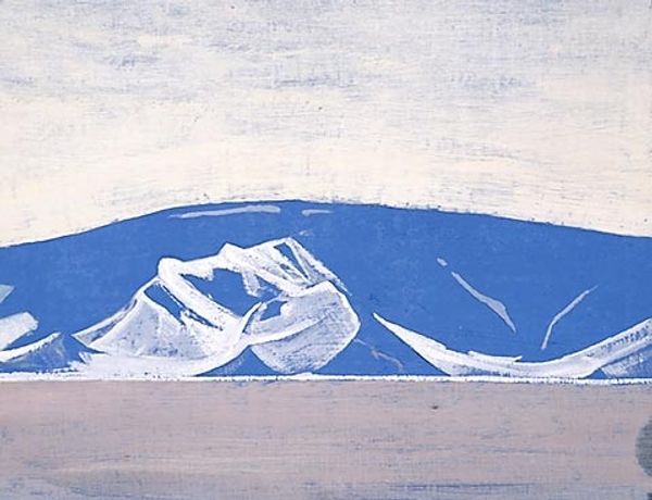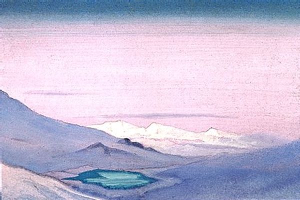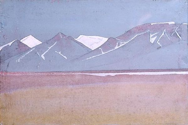 Nicholas Roerich made this painting, 'Place of Mahatma's camp. District Kuku-Nor,' with what looks like tempera, giving it this really smooth, almost chalky feel. The colors are muted, a pale sky meeting these soft, pinkish mountains. It’s like Roerich is capturing a moment, a fleeting impression of this place. What strikes me is how the paint is applied so evenly, no thick impasto or wild brushstrokes. Everything feels deliberate, almost meditative. The texture is minimal, but that doesn't make it flat. It's like he's distilling the essence of the landscape, paring it down to its most essential forms and colors. Look at the way the mountains meet the sky, it's a gentle transition, a soft meeting of earth and air. Roerich's landscapes often have this quality, a blend of the earthly and the spiritual. There's a calmness here that reminds me of Agnes Martin, a similar sense of quiet contemplation. Both artists find power in simplicity, in the subtle nuances of color and form. It’s a reminder that art doesn't always need to shout to be heard; sometimes, the quietest voices resonate the most.