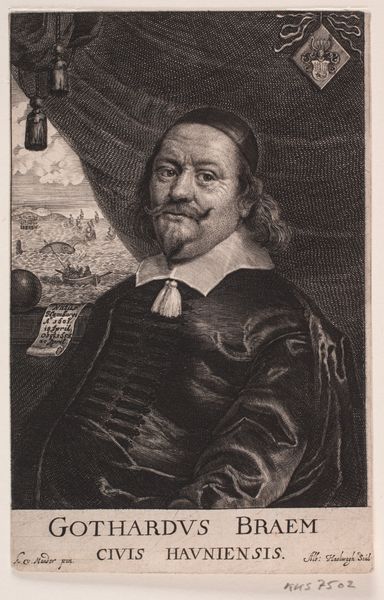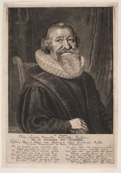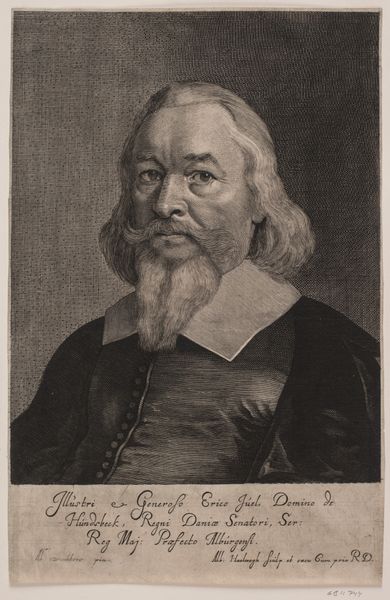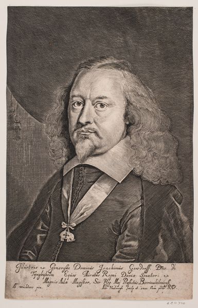Curator: I'd like to introduce you to Albert Haelwegh's portrait of Christopher Urne, made between 1655 and 1659. It's currently held at the SMK, Statens Museum for Kunst. What are your initial impressions? Editor: A rather imposing figure, wouldn't you say? The meticulous detailing in the engraving creates a strong sense of presence. There's an undeniable weight to the composition. Curator: Absolutely. Haelwegh has skillfully employed line and texture to define Urne’s features. Look at the density of lines used to build up the dark background and contrast it against the stark white collar, which directs the eye towards the face. The strategic use of hatching and cross-hatching is also evident. Editor: The symbolic weight he carries is literally displayed. The elephant pendant is what commands my attention. This likely signifies his affiliation with a particular order or perhaps alludes to qualities associated with elephants, such as wisdom, memory, and strength, qualities expected of a chancellor. Curator: A keen observation! The object signifies not just status, but identity, aligning personal branding within social semiotics of the era. But look also how Haelwegh uses visual rhetoric to convey this identity through very effective use of symmetry. The central axis runs straight through the face, dividing the man’s face. This formal technique underpins the sitter’s social positioning. Editor: The engraver also draws attention to Urne’s humanity, particularly in the rendering of his eyes and mouth, suggesting both power and vulnerability. There’s cultural memory embedded in such imagery. Urne becomes more than just a likeness, he embodies societal values and expectations. Curator: Indeed, Haelwegh’s sophisticated control of his materials delivers an astute rendering that merges individual presence and symbolic meaning. The textures of the skin, hair, and clothing are so vivid and complex. Editor: The artist leaves us much to unpack. One departs this image with much to contemplate about legacy, identity and representation. Curator: Precisely, it underscores the complexities inherent to the genre, doesn't it? How portraits function as both records and constructed statements.