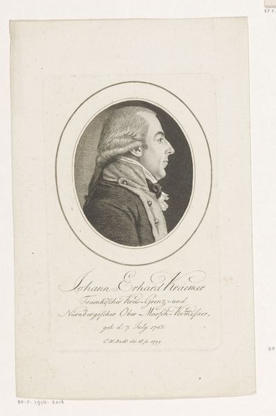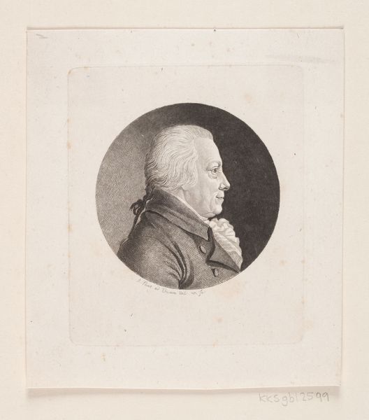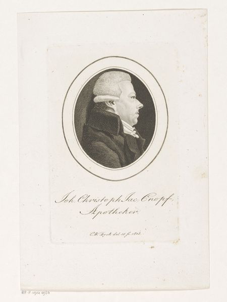 This is Christoph-Wilhelm Bock's 1799 engraving, a portrait of Johann Georg Dietrich. The image is dominated by its oval frame, within which Dietrich is rendered in profile. The lines are delicately etched, creating subtle gradations of light and shadow that define his features and clothing. The composition, with its emphasis on the head and shoulders, draws attention to the sitter's intellectual bearing. Bock's choice of monochrome lends the piece a timeless quality, typical of the Enlightenment era's fascination with reason and order. The oval frame itself acts as a visual metaphor. It encapsulates and perhaps constrains its subject, reflecting a broader cultural interest in classification and categorization. Consider how Bock uses line and form not merely to depict an individual, but to situate him within a network of signs and symbols. This engraving is not just a portrait; it's an exercise in representation, inviting us to decode the values and ideologies of its time.