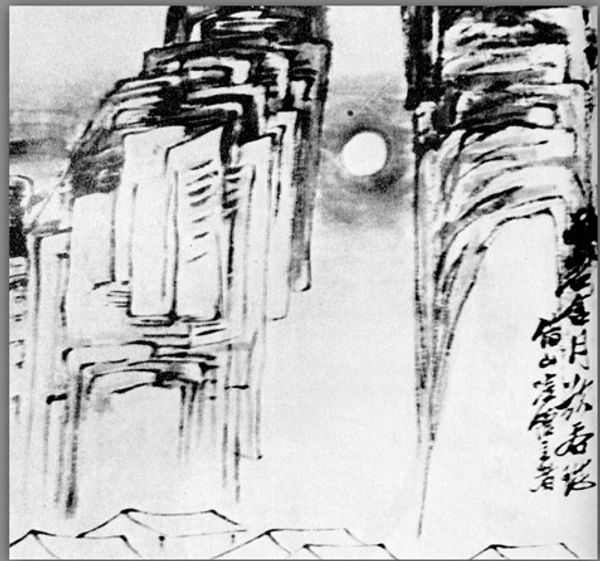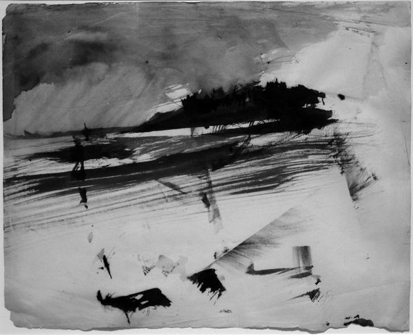 Curator: This spare ink drawing, titled "Landscape," was created in 1909 by the artist Qi Baishi. The composition features boats on water above several stark trees. What's your immediate impression? Editor: It feels stark and perhaps a bit melancholy. The monochromatic palette coupled with the stark lines evokes a sense of quiet contemplation, yet there is movement here—the sailing boats create a powerful suggestion of journeys. Curator: Yes, it captures the visual language that we see repeatedly in East Asian art history, drawing parallels to traditions such as ukiyo-e. Consider how line, often favored as a core aspect of visual expression over shadow and gradation, allows artists a symbolic short hand. Editor: The symbolism certainly jumps out. Ships, in particular, often stand as potent emblems of migration, displacement, and cultural exchange—it forces you to meditate on trade routes and the personal stories within. How does Baishi use the historical weight of these signs? Curator: It's more implicit than explicit here, I would argue. Baishi avoids overtly didactic or politicized readings by embedding familiar images within what might at first seem purely like a meditation on a peaceful natural scene. The weeping willows, another recurrent motif, are typically read as metaphors of melancholy, as you intuited initially. Editor: Which gives the boats—usually signs of hope or commerce—an entirely different aura. We're forced to reflect on their passage with some degree of skepticism, mindful of loss and colonial violence perhaps, rather than easy prosperity. Curator: Precisely, especially considering that "Landscape," emerged during a tumultuous historical moment marked by cultural exchange between Asia and the West, one where loss, negotiation, and compromise, are very visible undercurrents. Editor: The interplay of form and historical context enriches what could easily be dismissed as just a landscape piece. I appreciate the nuanced ways an ostensibly simple drawing invites dialogues about globalization. Curator: Ultimately, I agree. It shows how even seemingly quiet ink washes are inscribed with echoes of journeys both physical and metaphorical. A dialogue between nature, art history, and our own temporal existence. Editor: Yes, and this piece encourages us to think more deeply about the historical intersections embedded in commonplace imagery.