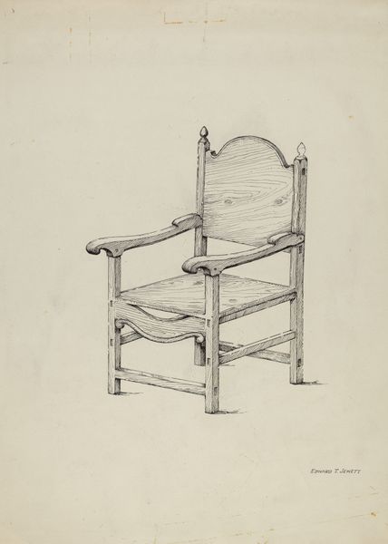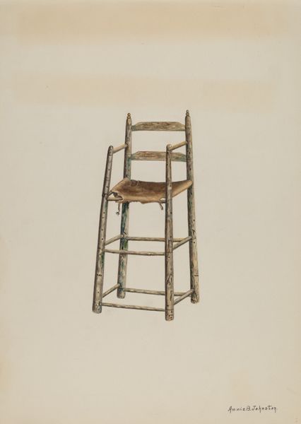 Editor: Here we have Henry Tomaszewski's "Chair," a watercolor and pencil drawing from 1937. There's something very serene about it, almost nostalgic. What can you tell me about how a simple chair drawing might speak to the times it was made in? Curator: Well, on the surface it appears to be just a simple rendering, right? But considering it was produced in 1937, we might interpret the subject and its visual treatment within a broader socio-political context. This was a period marked by widespread economic hardship in many parts of the world, following the Great Depression. What sort of imagery was promoted in art and media at the time, and how might this chair relate? Editor: I’m guessing there’s some implied message because the reality of life in the 30s was hard for many? The neutrality seems pointed, if that makes sense? Curator: Exactly. Think about social realism or socialist realism gaining prominence in different countries. These movements often focused on the lives of working people, depicting them with heroic undertones. An image of a solitary chair could be read as a subtle comment on domestic life, family values, the hope for quiet refuge within a turbulent world, and possibly an aspirational glimpse at modest comfort during times of scarcity. What purpose could this work have had for the artist? Editor: I see it as an almost silent commentary on that struggle. Or even a memorial for simpler times, before everything got so chaotic? Maybe even just something calm, against everything that was not at the time. Curator: It speaks volumes without bombast. Also, let’s not forget the social and cultural significance of crafts during this era, and how artistic traditions often served both functional and symbolic roles in society. Do you think that factors into this artist’s work, here? Editor: Absolutely. Considering all of that gives the chair a presence, an important historical weight. Curator: It's amazing how a simple object, viewed through a historical lens, becomes such a powerful carrier of cultural meaning, right? Editor: It definitely challenges the initial impression of simplicity. I will look at furniture differently from now on!