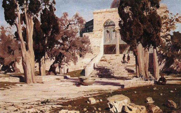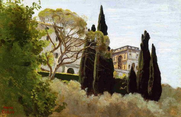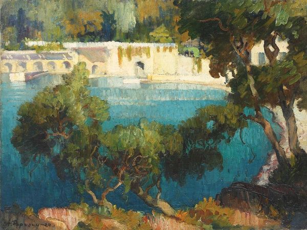 Curator: Abdul Mati Klarwein's "Outline" from 1984. A really compelling work painted in acrylics! Editor: It's lovely, isn't it? Very serene, yet with that curious clothesline cutting across the idyllic scene. What do you make of it? Curator: For me, this work operates on a very material level. Think about the labour involved in its making - grinding the pigments, stretching the canvas. Also, this wasn't made in a studio, but in "plein air." Editor: Ah, the actual location influenced the labor of the work? Curator: Absolutely. Furthermore, Klarwein's choice of materials is relevant to social context; he's using fairly common acrylic paint, as opposed to oils that were favored by many artists. Do you consider acrylic paint democratized painting at the time? And consider how the subject matter relates to production... Editor: I see. The mundane, like hanging laundry, intersecting with this seemingly timeless, romantic view, underscores that? Curator: Precisely! Consider too how mass-produced items – clothes pegs – enter the landscape, juxtaposing nature with products of industrial capitalism. He is pushing boundaries to consider the interplay between our relationship to what we produce and how we enjoy our nature. Editor: That’s a completely fresh way to view it. I had seen it as a simple landscape, but you've pointed out layers about process and making! Curator: And remember that “simple” is often a carefully constructed effect. Exploring the material elements gives us a richer reading. Editor: Right! Now, I appreciate this artwork on a much deeper level!