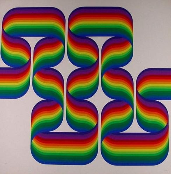 Editor: This is Corita Kent’s “Love Stamp,” created in 1985. I find its design so optimistic, even with just simple lettering and colorful strokes. It is like a joyful burst! What do you see in this piece from a formal perspective? Curator: I find the composition particularly compelling. Note the careful arrangement of the rainbow brushstrokes above the word "LOVE". It leads your eye downwards, a strategic decision on Kent’s part. Editor: Can you explain that a bit more? I wouldn't have considered it to be strategic, exactly. Curator: Consider the weight and directionality of each stroke. How the saturation creates a gradient. Kent used horizontal bars, balanced, to create a sense of visual stability which supports the text. It’s an underlying structural harmony in her work that enhances the piece. Even if we aren't supposed to send letters anymore! Editor: I suppose the bars could be seen as underlining the importance of Love, too. Curator: Perhaps, but it is the formal relationships – line, colour, shape and form - that communicate those associations and create the impact. Does considering this change your initial interpretation? Editor: Yes, a lot. The formal structures support a visual understanding and the balance in the work highlights its meaning, perhaps even more clearly than through symbolic interpretations. Curator: Precisely! The visual elements working together as the medium and message.