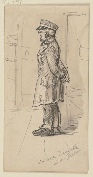 Curator: This intriguing pencil sketch, "Figuren op straat," whose title translates to "Figures on the Street," comes to us from the hand of Johannes Abraham Mondt. The artwork's date spans from 1869 to 1941. Editor: The immediate impression is of a fleeting moment, a stolen glance at a scene quickly sketched in a personal sketchbook. The tilted lines and scrawled figures definitely gives off that personal, from-life type of observation. It has the same sort of captured transience like those daguerreotype street scene photographs. Curator: Indeed. Observe the composition; Mondt employs a rather loose hand, rapidly defining the figures with subtle cross-hatching. It is evident Mondt leverages implied lines over crisp form to convey mass and space within the tableau. Semiotically, what inferences can we glean of street life simply via suggested visual cues? Editor: A band leader after a concert, perhaps, or an ice cream seller with his family, or, wait a minute, a group of tourists and a guard? And they are all standing right here in front of me... It almost seems as though the image comes straight out of the corner of a theatre or a lively public space from around that period. Is that an accurate feeling for the real period from where the art comes from, or my own projections based upon personal nostalgia? I am always curious of what’s the relation between feeling and history, as both mingle like street dust and our personal emotions Curator: Interesting proposition; and I am convinced one could read so much into this little drawing... it begs consideration, whether he intentionally obscured their visages or opted simply for gestural abstraction when defining his characters as visual signifiers, for an expressionist goal. Editor: A guard and those children! And maybe even the mother behind! Even now they pass right here close to the museums around the garden. Funny the ways time seems to converge—the streets from the sketch merging into today's urban fabric... You know? It's interesting, right? Curator: Time, indeed. Through line, light pencil work, and an open-ended narrative frame, Mondt leaves us contemplating the quotidian, its intrinsic aesthetic potential, and temporal reverberation.
