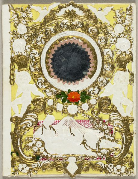 Curator: Here we have "Truly Thine (valentine)", an English greeting card created around 1860, now residing here at the Art Institute of Chicago. It’s a striking example of Victorian sentimentality, wouldn't you say? Editor: It is! My immediate impression is the intense detail. All that layered paper, the cutouts, the different textures... It speaks to a labor of love, literally. It really highlights the Victorian interest in the material world. Curator: Precisely! These elaborate valentines were quite the trend in the mid-19th century. Mass production meant materials were relatively accessible, but constructing these cards still signified dedication and social status. The imagery itself—cherubs, doves, flowers—reinforces prevalent ideals of romantic love and domesticity of the period. Editor: That’s a great point. How was something like this fabricated, though? Were different papers sourced locally or did they have to rely on outside vendors, potentially overseas for rarer components like metallic foil? That kind of material reality tells us a lot about consumption at the time. Curator: These valentines circulated within specific social networks and operated almost as performances of affection. Sending such an intricate piece publicly displayed one’s taste, refinement, and, crucially, financial capacity. It says "I care, and I can afford to show it". Editor: And it speaks volumes about craft traditions too. This wasn't seen as high art, right? More aligned with female domestic skills perhaps? Where were women situated in the manufacturing and reception of pieces like this? Curator: Victorian society relegated such activities to the domestic sphere, yes. However, some women undoubtedly commercialized these skills, creating cards for sale. Examining who benefited from this trade reveals some really interesting socio-economic dynamics at play. The production involved various levels of artistry and the marketplace had implications for gendered labor. Editor: Exactly! These material objects carry immense social weight; examining labor alongside materials, especially concerning who produced what and under which constraints, unearths buried social structures that the surface aesthetics tend to conceal. What looks beautiful on its face could indicate exploitation further down the supply chain. Curator: Thinking about the exchange and collecting surrounding these cards as valuable historical objects complicates notions around value, display, and who determines what constitutes art. It opens up all sorts of important critical discourse. Editor: I agree. Delving into process exposes these objects' profound connection to societal forces shaping not just consumption, but social order, which the delicate beauty and overt themes of affection only partially hint at. Curator: So true. Well, perhaps now we have given listeners a richer perspective from which to appreciate its surface and consider its depth. Editor: I hope so, that they leave considering not only what the artwork portrays but also the how, where, and who that constitutes its complex materiality.