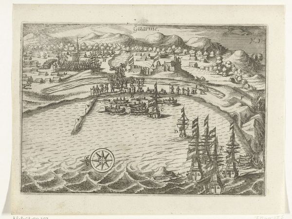 This anonymous engraving from 1620 depicts the siege of Papenmuts fortress, built by Maurits on the Rhine river. The image is a fascinating example of the politics of imagery in the early 17th century. It not only documents a military engagement, but also presents a specific viewpoint on the Dutch Republic's conflict with its enemies. The meticulous details of fortifications, troop movements, and naval activity serve as visual codes, communicating the strategic importance of this location. The engraving reflects the cultural and economic structures of the time, where control over waterways like the Rhine was crucial for trade and military dominance. To truly understand this artwork, historians consult various sources like military records, diplomatic correspondence, and cartographic archives. This helps us comprehend the social conditions that shaped artistic production and allows us to reflect on art's meaning as contingent on its social and institutional context.