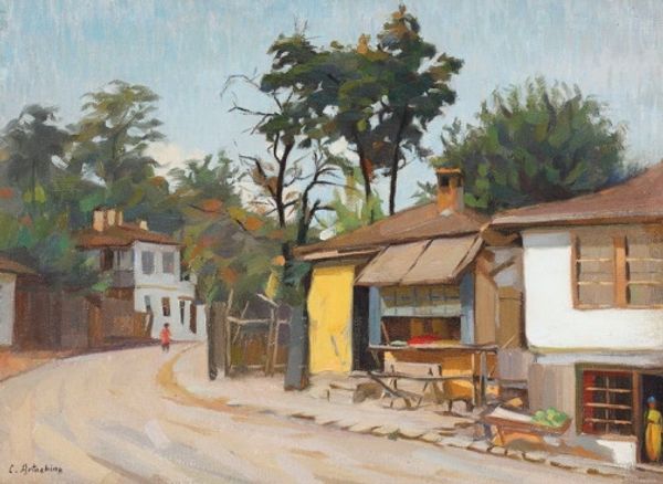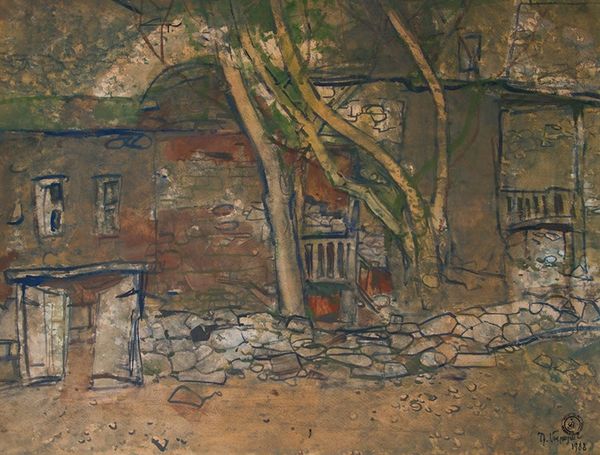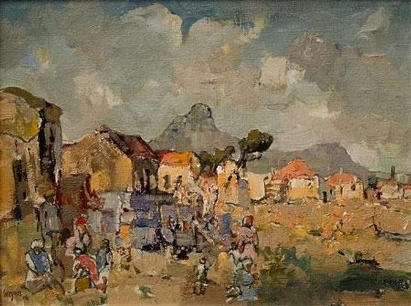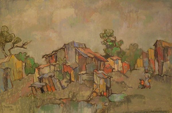 Curator: Looking at Gregoire Boonzaier's "Squatter Camp," the first thing that strikes me is how bleak the color palette is. The overwhelming grey of the sky really casts a pall over the whole scene. Editor: Yes, and it's interesting to note how that somberness contrasts with the clear visibility of the brushstrokes. Boonzaier has laid the oil paint on the canvas with a textural exuberance, calling attention to the physical making of the artwork. Notice how even the corrugated iron structures show evidence of painterly manipulation and technique. Curator: It does create an interesting tension. But consider also the sociopolitical landscape of South Africa. What statement do you think he might have been trying to make about those conditions by immortalizing this place, this community? Editor: Given that Boonzaier identified as a realist painter, I think it's important to acknowledge his interest in faithfully rendering what he sees around him, focusing more on the arrangement and qualities of raw materials and perhaps less on critical social issues or commentaries on wealth, power, and resource extraction. I believe he simply wanted to explore color relations or perhaps he took a cue from artists like Van Gogh and his interests in expressing personal sentiments via the observation of nature. Curator: I see your point. Yet, the very act of depicting a squatter camp—a space born of inequality—carries inherent socio-political weight, whether intended or not. We are left wondering: Whose gaze is this for? Whose narrative is being prioritized? Editor: But to analyze from a production-based perspective, look at his tools: brushstrokes thick with oil paint give texture to shacks. What stories are told in his mark-making? How do these brushstrokes mimic and celebrate the marks that laborers leave behind in forging steel, cutting timber, or assembling sheet metal into improvised buildings? These are crucial parts of the artwork's language too, and speak as loudly as any possible meaning ascribed to its iconography. Curator: That’s a valid observation. It encourages us to delve deeper into the intersectionality of form and context and to acknowledge the multifaceted and very tactile realities within which art is created and exists. Editor: Indeed, and when we center process in our thinking about this painting we create space to meditate on the complex negotiations between an artist's creative autonomy and art’s capacity to be a historical record of real people and real places. Curator: Food for thought, to say the least. This journey certainly gives us much to think about.