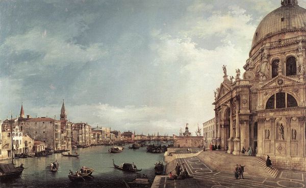 Curator: Looking at Canaletto’s “Piazza San Marco, Looking East,” painted around 1760, what immediately strikes you? Editor: It’s… vast, but oddly intimate. Like peering through a keyhole at a bustling dream. All those tiny figures, swallowed by the architecture. It feels… expectant, you know? Like something's about to happen. Curator: Indeed. Canaletto’s precision in capturing the architectural details while animating the piazza with daily life reflects the booming Venetian art market's fascination with vedute, or view paintings. Consider the production and consumption cycle: Venetian workshops churning out views for wealthy Grand Tourists eager to take home a piece of the city. Editor: That almost makes it sound cynical! But there’s a real joy in the light here, dancing off the stones. I see these figures in their little daily dramas. Does it humanize the powerful perspective? Is this tourism or honest representation? Curator: The question isn’t so much authenticity as understanding the purpose. These paintings were commodities, skillfully crafted using techniques like the camera obscura to ensure accuracy and appeal to the patrons' desires. Materials were meticulously sourced. Canaletto's studio operated almost like a factory. Editor: Hmm, a factory turning out beauty… or perhaps beauty *from* the factory. Those endless arcades and soaring facades; the muted palette evokes a sense of serenity. I get that Grand Tourists were essentially buying status, the equivalent of a gilded age selfie, but there's something genuine here. Something to touch you, to whisper: "Remember this." Curator: But it's crucial to consider this artistic choice within its social context: these images reinforced existing power structures, highlighting the grandeur of Venice for those who already possessed privilege. How does one represent a society and for whom is it actually represented. Editor: I suppose, a gorgeous souvenir for the one percent. Still, the way Canaletto balanced rigorous architectural precision with that feeling of everyday life… dogs scampering about and gossip. Even the sky is doing the artist a kindness. So there! Curator: Perhaps there's room for both awe and critique. That's where the true power of this piece resides. Editor: Yeah, even mass-produced beauty can whisper something worthwhile. Now, about those canals...
