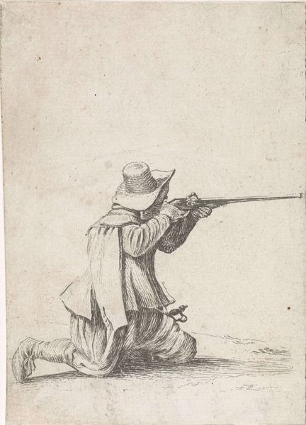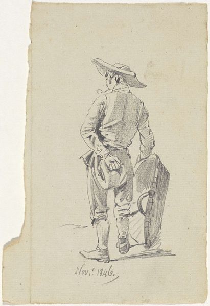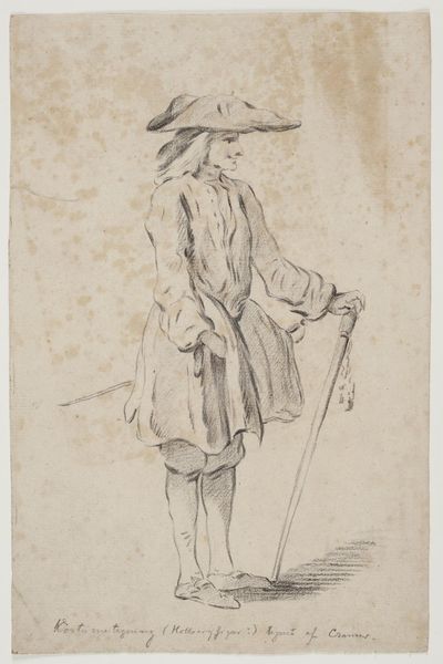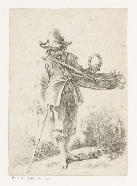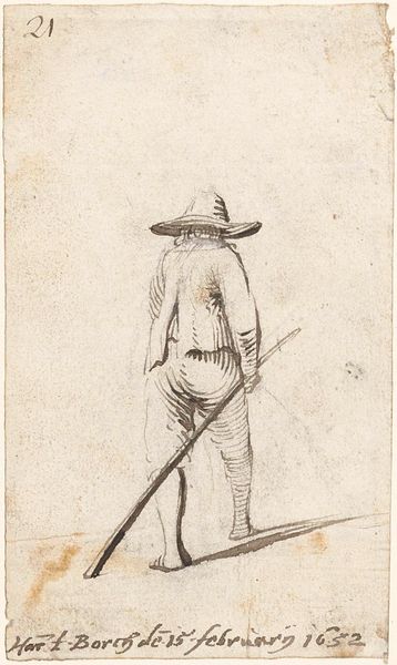 Curator: Harmen ter Borch, possibly in 1653, captured this shepherd and his flock in a delicate pen-and-ink sketch, held here at the Rijksmuseum. There's a subtle Baroque touch to it. Editor: Immediately, the muted palette evokes a feeling of gentle solitude. The lone shepherd, viewed from behind, creates a sense of anonymity—almost as if he's melting into the landscape. Curator: Ter Borch has an amazing capacity to create symbolic images of idealized rural existence. Consider the recurring iconography of sheep herding in art and religious writing. It symbolizes a shepherd’s profound moral duty to lead and protect his flock—almost paternal and devout. Editor: I appreciate your viewpoint; and yet I'm also compelled to examine this pastoral image in the historical context of labor and land. For some audiences today, images of farmers can carry strong political and socio-economic implications about inequality and cultural identity. Curator: That’s insightful, and true that depictions of labor can become symbols. But here, Ter Borch’s almost ethereal rendering, with the delicate lines and the figure’s averted gaze, suggests to me a quieter, perhaps even melancholic reflection on human stewardship. The shepherd, as a symbolic protector, perhaps suggests the moral compass of 17th-century Dutch society. Editor: I find myself lingering on that "back view," actually. It removes the individual agency of the figure; his gaze, emotions, and reactions are deliberately obscured. Does that make him a stand-in for a universal, perhaps idealized peasant figure... or a symbol of enforced societal conformity and lack of self-determination among laboring peoples? Curator: A compelling challenge to that bucolic reading. These visual ambiguities certainly offer fertile ground for us to continue examining Ter Borch’s work. Editor: Indeed. The dialogue between tradition and the present is perhaps where this work truly finds its power.