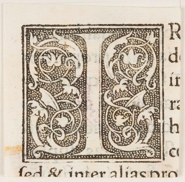 Curator: This image presents an initial "I," artist unknown, currently residing in the Harvard Art Museums. Editor: The density of detail packed into such a small space is striking. It feels weighty, almost monumental, despite its probable diminutive scale. Curator: Precisely. Note the texture created by the stippled background against the stark white of the letterform. The contrast lends the "I" visual prominence. Editor: And those serpentine dragon heads intertwined with the foliate designs...they immediately conjure up images of illuminated manuscripts, a sense of the sacred and the authoritative word. Curator: The graphic nature suggests this "I" may have been used as a printing element. Editor: The image evokes a lost world of craftsmanship and painstaking labor. It makes me wonder what text this initial "I" once introduced. Curator: A fascinating detail to contemplate as we consider its formal qualities. Editor: Indeed. Every detail tells a story, real or imagined.