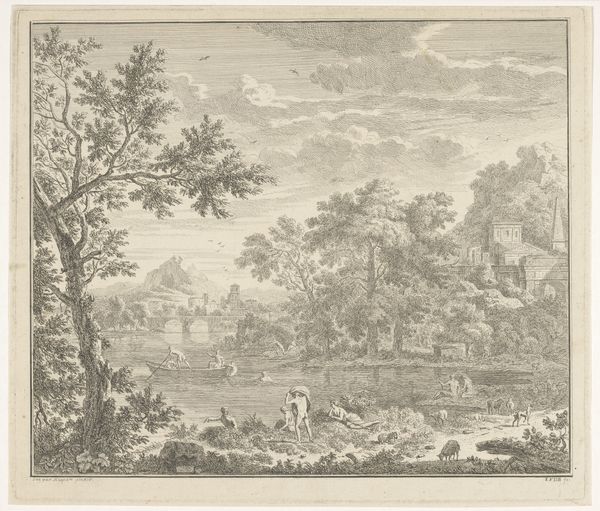 Curator: Reinhart's "Aricia" presents us with a landscape, rendered with meticulous detail. The figures almost seem secondary to the sweeping vista. Editor: The rainbow arcing in the distance—surely that's meant to symbolize something beyond just atmospheric conditions. What do you make of it? Curator: It might speak to hopes for prosperity, or the societal yearning for an arcadia removed from labor. Look at the leisure of those gathered by the tree. Editor: Leisure, perhaps. Or maybe there is a bittersweet edge, a longing for innocence that's forever out of reach. The rainbow feels almost like a phantom. Curator: The printmaking process itself becomes significant. The labor involved in creating this idyllic image mirrors the labor it obscures. The materiality of the print is a product of many hands. Editor: And yet, despite the clear societal critique, the composition draws me back to that rainbow – the promise of something just beyond the horizon. Curator: A delicate balance between critique and longing, then. I find the interplay fascinating. Editor: A shared viewing experience can enrich our understanding. Thank you.