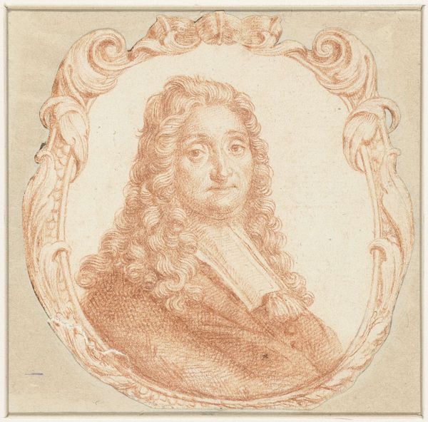 Editor: This is a drawing from 1719 titled "Portret van Gerrit van Heerstal" by Hendrik Budde, made with pen, ink, and charcoal on paper. The details are just incredible, especially in the hair. What draws your eye when you look at this piece? Curator: The controlled and precise hatching certainly stands out. Note how Budde uses this technique, modulating the density and direction of the lines, to create the illusion of volume and texture in Gerrit van Heerstal’s face and clothing. This method invites us to consider how the artist manipulates line to render form, essentially building the image from the ground up. Editor: It’s interesting how much detail he gets using just lines and hatching. Do you think the limited color palette adds or subtracts from the work? Curator: A restricted palette emphasizes form. Look closely—does the ochre wash activate the paper or simply provide a grounding for the composition? Also, consider the geometric form that contains the portrait. The relationship of these formal choices contributes to its overall success, offering a sense of visual harmony. Editor: So, focusing on the technical choices helps us understand the artwork on a deeper level. That's fascinating! Curator: Indeed. By carefully analyzing elements like line, form, and composition, we can discern much about the artist’s intentions and the inherent qualities of the work itself, wouldn't you agree?