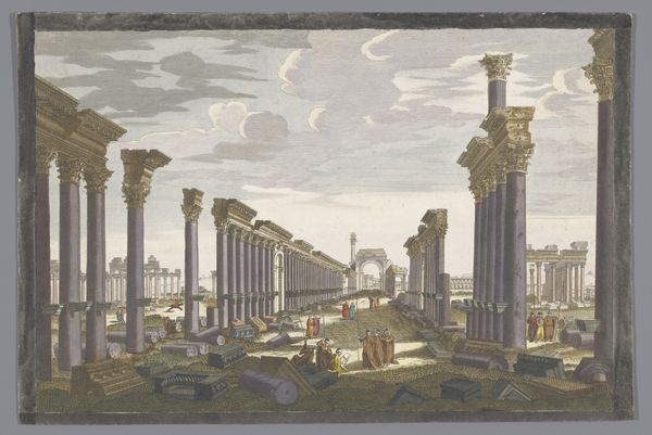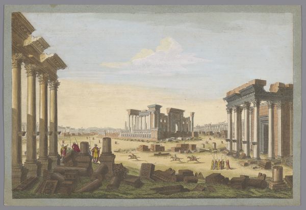 Editor: So, this drawing, "'Romersk' prospekt," by Jens Petersen Lund, dated sometime between 1730 and 1793...it feels like a study of ruins, maybe done *en plein air* given the looseness of the ink and watercolor. What historical context shapes how we should view a scene like this? Curator: That's a perceptive reading. The depiction of ruins became incredibly popular, fueled by the Grand Tour and the rise of Neoclassicism. Artists, particularly those from Northern Europe, flocked to Rome to study classical antiquity. They sought authenticity in their renditions. What do you notice about *how* Lund depicts these ruins? Is it simply documentation? Editor: Well, there's a romantic quality to the decay, almost like the buildings are melting back into the landscape. The tiny figures in the foreground seem dwarfed, highlighting the monumentality but also the impermanence of these structures. Curator: Exactly! And that's where the politics of imagery comes in. While seemingly objective, these prospect views participate in constructing a specific narrative of power and history. Who controlled the image of Rome? Who could afford to travel and commission such works? It wasn't simply about appreciating the past; it was also about claiming a lineage and a cultural superiority. Consider the choice of perspective – is it accessible to all, or is it reserved to the empowered few? Editor: So, the drawing isn’t just a neutral depiction but an active participant in a broader cultural and political conversation of its time? Curator: Precisely. Lund's work reflects the prevailing attitudes of his era. It also reveals a certain longing for a 'classical' past. These weren't just records but carefully crafted statements about civilization, decay, and the ongoing power dynamics within European society. Editor: That really shifts my understanding of it. It’s more than just a pretty landscape drawing. I didn’t consider the inherent power dynamics baked into what seems like an objective art piece. Curator: That's the key! Art doesn't exist in a vacuum, but it's always engaged with the forces and politics of its own time.