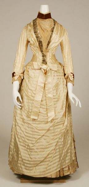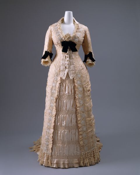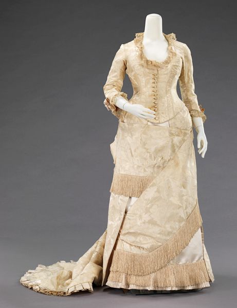 Editor: This evening dress, dating from 1871 to 1875, is a textile artwork residing at the Metropolitan Museum of Art. The Romantic style, the intricate details, and the emphasis on the silhouette really make it stand out. How should we interpret this piece in the context of its time? Curator: Looking at this dress, it’s essential to consider the strict social codes that dictated women's lives during this period. The restrictive nature of the corset, the layers of fabric—these weren't merely aesthetic choices. How do you think the dress might have functioned as both a symbol of status and a constraint on the wearer? Editor: That’s a powerful way to look at it. I guess I hadn't thought about how literally constricting it must have been. What would the act of wearing this dress have communicated about the wearer's identity and role in society? Curator: Exactly! Think about it. The expense and impracticality signalled wealth and leisure, while the shape rigidly conformed to ideals of feminine beauty—an ideal often unattainable and harmful. Do you see elements of resistance or subversion in its design, or is it a complete capitulation to the era's expectations? Editor: I think I see your point; while the silhouette seems very conventional, the touches of pale pink almost soften what could be imposing and restrictive dark colors, offering a little playful freedom within constraints? It is not total submission; that makes me wonder whether some women used fashion as a careful means of restricted agency. Curator: Precisely! That tension between conformity and individuality is what makes studying historical fashion so compelling. This was more than just clothing; it's a language reflecting a complex power dynamic between women and society! Editor: Absolutely. It definitely brings a fresh appreciation for the artistry involved and for how it spoke volumes about women’s status and even silent rebellions. Thank you; seeing it this way really transforms my perspective!