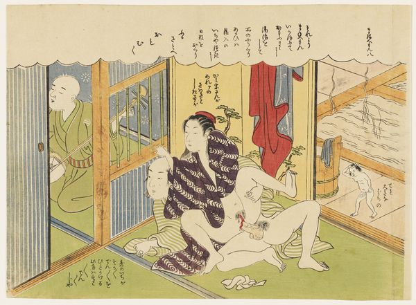 Utagawa Kunisada created this woodblock print, “Ogura Imitation of the One Hundred Poems," sometime before 1865. The composition is divided into distinct zones that blend text and image, creating a multi-layered narrative space. The poem's inscription sits above a scene depicting figures in what seems to be an interior setting. The visual structure invites a semiotic reading. Note how Kunisada uses the grid pattern on the figures’ robes, the geometrical shapes, and the contrast between flat, patterned surfaces and the illusion of depth achieved through linear perspective. The combination creates a tension between surface and depth. This tension destabilizes the viewer's sense of space. Consider, too, how Kunisada uses culturally specific codes and symbols. The poem, the style of dress, and the interior decor all point to an established set of cultural meanings. Yet, the artwork also seems to disrupt these meanings, presenting a world that is both familiar and slightly askew. This constant play with established codes is part of the print's enduring appeal. It challenges us to actively engage in its interpretation.
