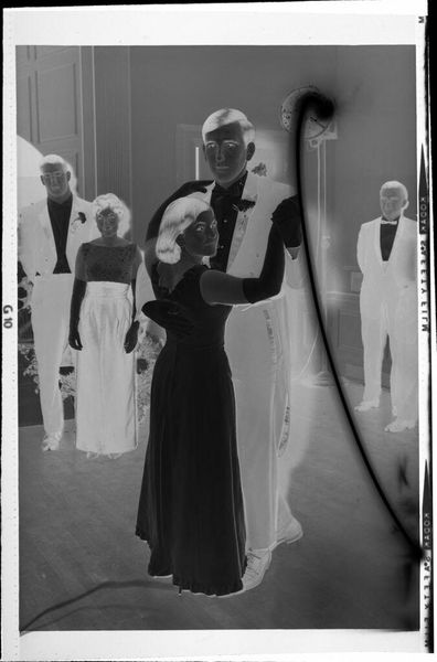 Curator: Oh, wow, this image practically vibrates with energy. It’s an untitled photograph by Lucian and Mary Brown, depicting a man lifting a woman in a dance pose. The negative shows the dancers in striking contrast to the orchestra behind them. Editor: It's incredible, isn't it? The high-contrast negative really heightens the sense of drama and motion. It almost feels like a snapshot from a dream, or a memory struggling to surface. Curator: Definitely! The choice to capture this moment as a negative adds another layer to its interpretation. Consider the socio-political undercurrents of dance halls and the music scene, then and now. Editor: It's interesting to imagine what the Browns might have been aiming for. Was it the thrill of the performance or simply trying to capture that fleeting moment of freedom? Either way, it's a beautiful piece. Curator: Absolutely. It makes you wonder about the untold stories within the image. Editor: Yes, all that hidden energy… just waiting to be brought into the light.