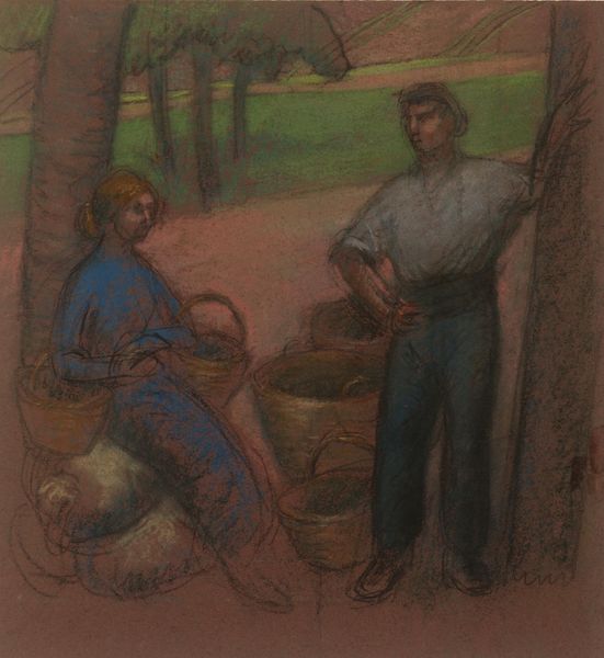 Curator: Oh, there's such a languid warmth radiating from this piece; it's almost a honeyed light. Editor: You're right, it's idyllic. We're looking at Thomas Hart Benton’s "Roasting Ears," painted in 1939, an oil painting capturing a moment in rural America. It portrays a man in a cornfield, presumably harvesting. Considering its date, what readings can we develop about Benton’s subject choice and presentation? Curator: It really makes me think about those summer days when everything just kind of… slow cooks. Do you think he idealized this agrarian simplicity a little bit? There's this peacefulness, but you also sense a hidden story. Editor: Absolutely, and this is part of the complex debate around Regionalism, of which Benton was a leading figure. On one hand, the movement aimed to depict everyday American life during the Depression, offering an accessible alternative to European Modernism. On the other hand, its representations, especially those involving African Americans, can be viewed through a lens of racial romanticization, downplaying the harsh realities of systemic oppression. Curator: It does make you wonder, doesn't it? There is an undeniably graceful bend in the corn stalks, echoing the gentle curve of the tree in the background. What did that harmony represent to him, to his audience? Editor: Perhaps an idealized vision of an America in harmony with nature, a vision that, while visually appealing, might have served to obscure the racial and economic inequalities deeply entrenched in rural America. Curator: Hmm, you have given me pause! It makes you appreciate the skill while feeling unsettled by its undercurrents. I’ll not look at a stalk of corn the same way! Editor: It is a good opportunity for the artwork to open up a multilayered dialogue—acknowledging the artistic achievements and being critical about the implicit ideologies within representations of people and places. Curator: Well said, a painting both lush and deeply considered. I think that’s our job done here! Editor: Indeed. Food for thought.