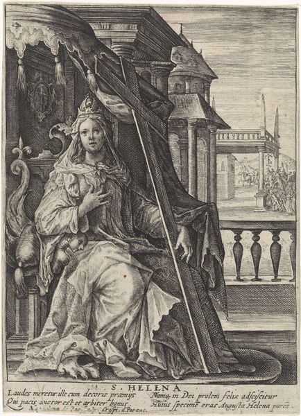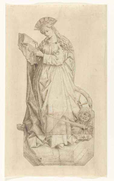 Domenico Ghirlandaio painted St. Barbara Crushing Her Infidel Father, which is now in a private collection, with oil on panel. Notice how the pyramidal composition, with St. Barbara at its apex, directs our gaze upward, but is grounded by the defeated figure of her father beneath her feet. The verticality of the tower, held in her left hand, contrasts starkly with the horizontal form of her father’s prone body. This contrast between vertical aspiration and horizontal defeat is central to the painting’s meaning. Ghirlandaio uses a symbolic structure that places the sacred over the profane, with color and line reinforcing this hierarchy. The soft, muted tones of the landscape behind her provide a subtle backdrop, contrasting with the bolder, more saturated reds and blacks of St. Barbara’s attire. Note the interplay between the realistic depiction of the figures and the more symbolic representation of the landscape; this combination invites us to consider the painting as both a narrative and an allegory. Ultimately, the painting's formal structure serves to elevate St. Barbara, transforming her into an almost architectural figure of faith and defiance against earthly tyranny.