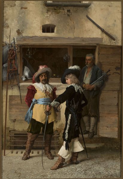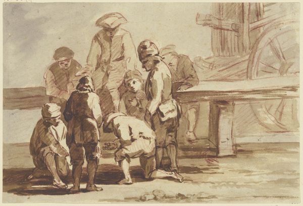 Curator: I find myself drawn to the subdued hues of this watercolour illustration, its atmosphere conveying a hushed expectancy amidst the violence it implies. There’s something incredibly haunting and poignant in its seeming quietude. Editor: Indeed. The artwork, titled "A rest during the bullfight", was created in 1881 by the Spanish artist Joaquín Agrasot. It's an interesting genre piece, capturing a moment of respite amidst the drama and spectacle of the bullring. It seems the piece offers us access to what is taking place behind the scenes, even beyond the bullfight itself. Curator: Right, there's this almost eerie tranquility to it. I can almost hear the quiet murmur of conversations. There's something very contemporary about how Agrasot seems to capture not the bullfight, but the in-between moments of that performance. Do you think there is something about contemporary culture that continues to inspire our fixation with such brutal performative activities? Editor: It's difficult to say if Agrasot’s work here might comment on this fixation you discuss. However, it is hard to ignore the work's relationship to portraiture, which historically tends to create lasting gazes on specific actors of our cultures, usually men. To focus the historical importance of portraiture on this piece, the work makes commentary about gendered power relations in late 19th century Spanish culture. Bullfighting, as a practice, does operate within similar hierarchies of power and gender. Curator: Hmmm, while I can see the artist using those tools, in portraiture and genre painting traditions, to signal masculine identity construction, I think the work's real pull lies in the sense of fleeting moments. We catch this pause, before those shown in the work will resume performing very carefully designed, sometimes violent and terrible, feats. Editor: That temporality certainly complicates it, doesn't it? Perhaps Agrasot encourages us to consider that identity itself, even power and brutality, is itself transient. A worthwhile idea that invites us to engage with his painting.