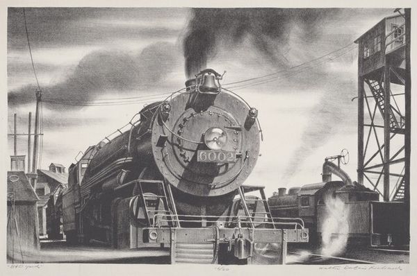 Editor: Here we have Eric Ravilious' "Midnight Sun," a 1940 watercolor and pencil drawing depicting a ship at sea. It’s quite a stark scene, very industrial but also serene, focusing on what looks like the deck and gun mount of a warship, contrasted with a stylized sun. What’s your take on this piece? Curator: This artwork immediately directs my thinking towards its context during wartime. The materiality here, the pencil and watercolor on paper, feels almost like a sketch, a document produced rapidly, reflecting the urgency of wartime production. How do the visible processes – the application of color and line – inform the work? What can we infer about its purpose and audience, given its making? Editor: So you see it primarily as a product of its time? I hadn't really considered it beyond its visual impact. What do you mean about it purpose and audience? Curator: I wonder about the labour embedded within this image. It isn't a celebration of heroism, or even the war effort necessarily. Ravilious emphasizes the mundane – the functional aspects of naval equipment. Consider where it was shown, to whom and why? I would argue its social and historical purpose impacts heavily how we can interpet its function. Do you agree with that argument? Editor: I think I see what you're getting at. The focus on the "everydayness" almost makes the piece itself an instrument - maybe of observation or record keeping in that historical context. That impacts the viewer differently if the work has practical functions to it, as opposed to a purely artistic statement. Curator: Exactly. We consider the act of its making in the face of war: rationing, potential material shortages, labour division...these material conditions bleed directly into our understanding and appreciation of the image and our personal reactions to it. Editor: I didn't initially connect it that way, but understanding it through the lens of production and circumstance definitely adds layers of meaning to Ravilious’ work. It really is fascinating when you consider those angles of the image and how they are inevitably tied into it’s history. Thanks for that explanation!