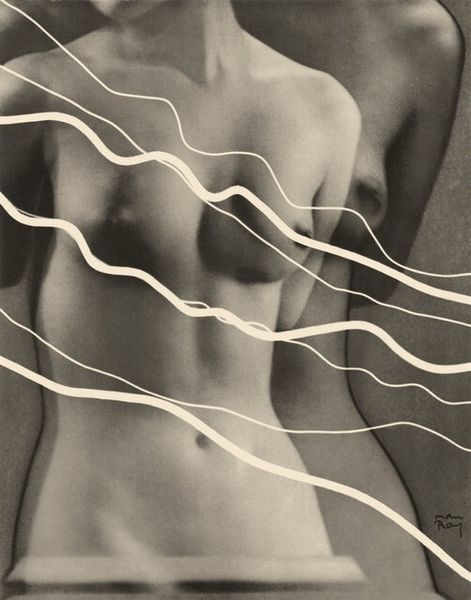 Editor: Man Ray's "Salle de Bain," created in 1931, is a striking gelatin silver print. It’s so stark; the black and white contrast is really intense, almost dreamlike. How do you interpret this work? Curator: The interplay of the nude figure, the sharp geometric line, and that cylinder…it evokes a primal image of form and containment, almost womb-like. Consider how bathing rituals themselves are ancient purification rites, loaded with symbolism across cultures. The harsh light transforms the familiar space into something abstracted, almost surreal. Does that resonate with you? Editor: I see that. The body is fragmented, reduced to these curves and planes. It feels almost dehumanized, like a classical statue. Curator: Exactly. Ray strips away the personal, offering us a glimpse into archetypes, primal memories of beauty, form, and the physical world. The bathing space transforms into a symbolic site, prompting contemplation about humanity, femininity, and identity. What do you make of that distinct line? Editor: I initially thought it was purely design, but now I see it kind of contains and restricts the figure, creating this tension. Curator: Precisely. And think of how Ray’s surrealist contemporaries explored these themes—identity, the body, anxiety, all visualized through bold images with psychological depth. Editor: It is incredible how Man Ray created all these tensions with such basic elements. The conversation also made me realize the image’s connections to deeper ideas like purification and archetypes. Curator: Exactly! Sometimes, simplicity in presentation masks profound layers of historical and cultural symbolism. The key is in deciphering that symbolism to access collective memories.