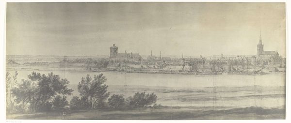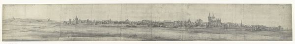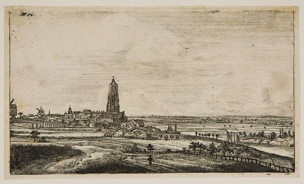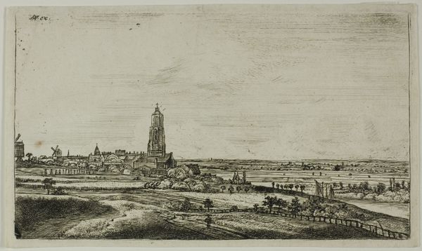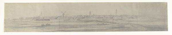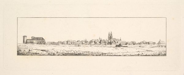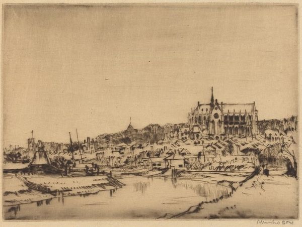 Curator: Muirhead Bone created this etching, drawing, and graphite work titled "Distant Oxford" in 1905. What's your first take? Editor: It feels…nostalgic. The subdued tones evoke a quiet melancholy, like a memory fading at the edges. I find the overall feeling quite serene. Curator: Yes, there is a pervasive calm to it. Knowing the time it was created, right at the cusp of major shifts in British society and just before the first World War, do you feel the etching is potentially capturing something about the changing role of places like Oxford in the British cultural psyche? The piece almost asks who had access to these hallowed institutions. Editor: That’s a very compelling point. In terms of iconography, Oxford has always stood for intellectual authority, tradition. However, Bone chooses a distant vantage point. The ethereal spires, while present, are diminished, made delicate by the atmospheric perspective. It doesn’t celebrate power; instead, the etching acknowledges Oxford’s enduring presence, but perhaps also its detachment. Curator: I agree that the distance is crucial, though to expand on that I wonder who is this intended observer and what is the artist signaling? Is Bone highlighting how tradition could remain out of reach? Are there more critical social-political issues beneath what might initially read as simply a pleasant landscape study? Editor: Thinking about that…look at how the artist uses lines and light. The strong foreground shadows and the dark cluster of trees, juxtaposed against the lighter skyline, could symbolize barriers—historical and social ones. Curator: Exactly. The figures, too, are so small, so ordinary. And look at that rough wooden fence taking up much of the composition in the foreground! Editor: Symbolically it's compelling. In short, while on the surface, it’s a cityscape, "Distant Oxford" has a potency derived from that contrast between idealized cultural imagery and concrete representation. Curator: A view that allows the viewer to question, beyond the immediately visible scene. That intersection gives this piece power. Editor: Precisely. It lingers in the mind, not just as an image, but as a question.
