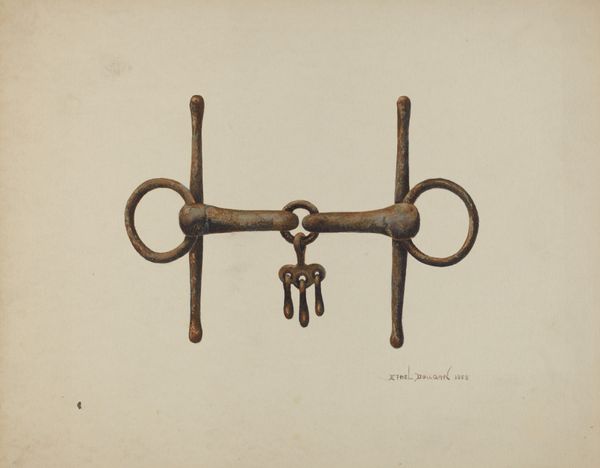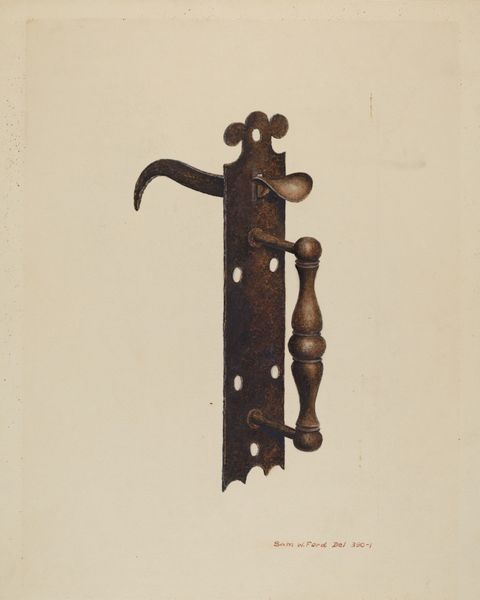Curator: Alexander Anderson's "Handled Door Latch" from 1940 rendered in watercolor and drawing, an intriguing confluence of medium to portray a simple utilitarian subject. Editor: At first glance, it feels stark, almost lonely. It’s not just the subdued palette; the door latch depicted so plainly gives a sense of separation and stillness. Curator: Separation seems spot on! The very function of a latch is about controlling access and defining spaces, isn't it? Anderson isolates the object, urging us to focus on the beauty, labor and history embedded in the simplest mechanism. Editor: Indeed. Thinking materially, you see the craftsmanship involved in shaping the metal; and there's a narrative right there in the patinated metal. These aren't pristine surfaces; they tell stories of countless hands and movements over time, an interaction and reliance with the land. Curator: Exactly, It whispers stories, it doesn’t scream them, about lives and routine! You see how delicately the watercolor conveys the texture? Like capturing the soul of the steel rather than merely documenting its form! Anderson elevates something so easily overlooked. I find something profound in this quiet appreciation. Editor: That subdued quality gives it a powerful emotional resonance. What's intriguing for me is the blurring of art and object. It forces you to confront questions about utility, decoration, the hand made versus the manufactured – all while appreciating this detailed artwork as itself a singular and laborious object. Curator: It is about how this artwork allows something seemingly insignificant to reveal itself with grace and elegance; prompting introspection of overlooked moments and elements within our lives. It urges one to value labor, both physical and artistic, as interwoven. Editor: Agreed; it's that delicate balance—how the materials and social context inform both the art and our understanding.