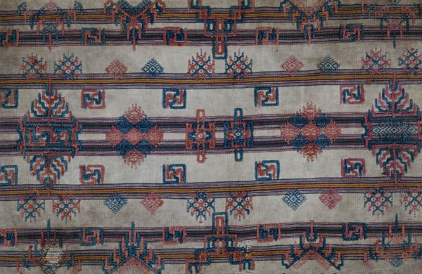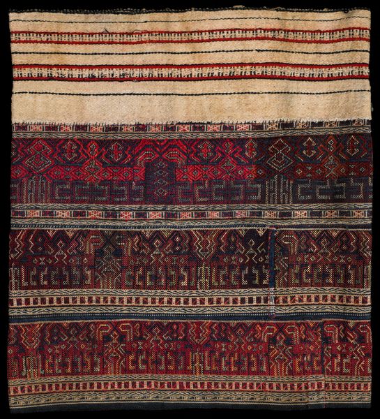 This ceremonial skirt, or tapis, by Abung, captivates with its intricate patterns woven into the fabric. The composition strikes a rhythm of horizontal bands in earth tones. These bands, filled with stylized zoomorphic figures and geometric motifs, create a visual language inviting us to decode its cultural meanings. The structure relies on repetition and variation. Note how similar figures recur, yet each band introduces subtle shifts in color and pattern density. This interplay establishes a semiotic system where each element is a sign. As the eye moves across, a sense of symbolic depth emerges. The artist's mark becomes a cultural record, and each symbol carries stories of cosmology, status, and social identity. The ceremonial skirt stands not merely as a textile but as a complex text. Through weaving, the artist has engaged in a philosophical endeavor to express a community’s worldview.