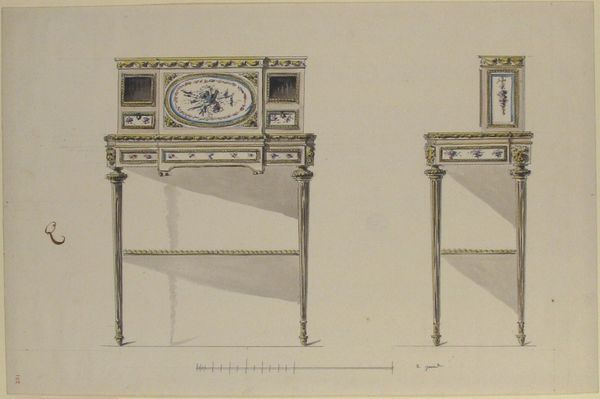 This is an anonymous design for a console table, rendered in watercolor, ink and graphite. Observe the recurring motif of the rosette, prominently displayed at the center. The rosette, a stylized flower, is more than mere decoration; it's a symbol of cyclical renewal and cosmic harmony, tracing back to ancient Mesopotamia and Egypt. This symbol has resurfaced in various guises throughout history. We find it in the rosettes adorning Roman sarcophagi, promising rebirth. It appears again in the Gothic cathedrals, echoing paradise. Like a powerful, collective dream, the rosette's significance has subtly shifted across cultures, yet its essence endures. It is a potent symbol that engages viewers on a subconscious level, triggering a deep-seated longing for continuity. It highlights the enduring power of symbols to transcend time, weaving a complex web of cultural memory that connects our present to the distant past.